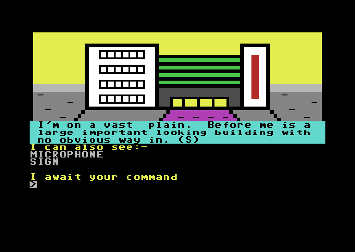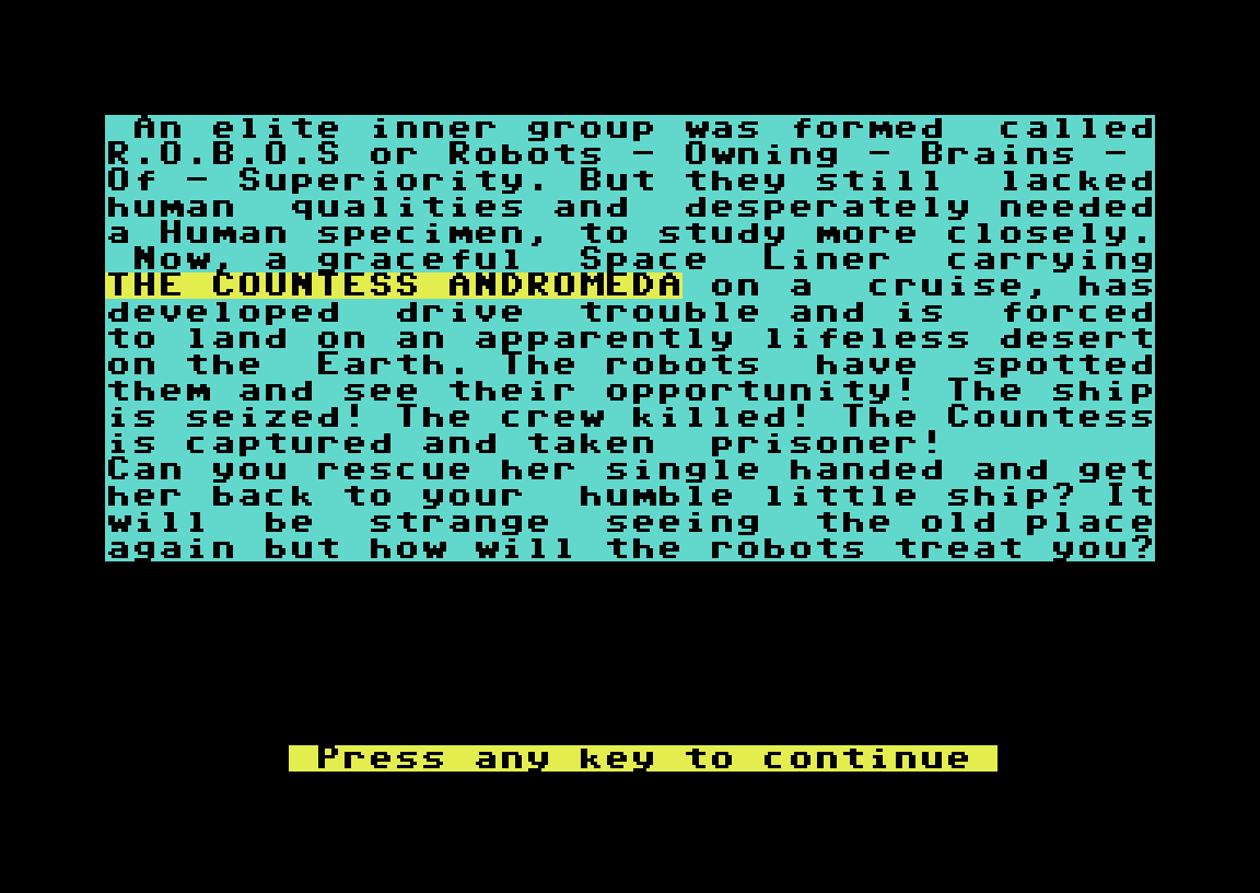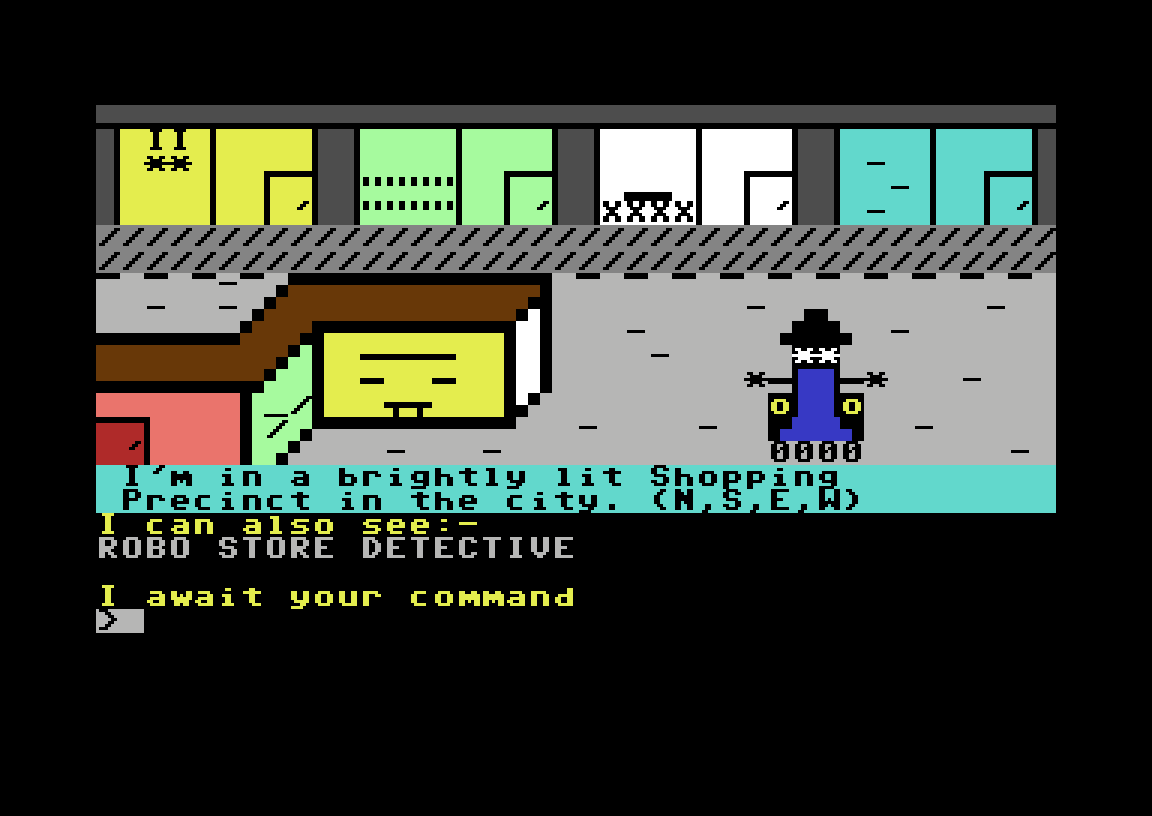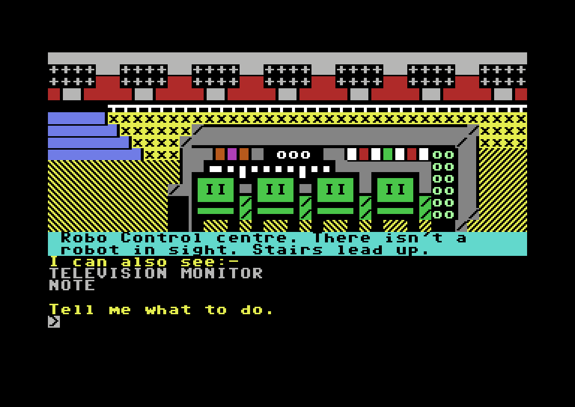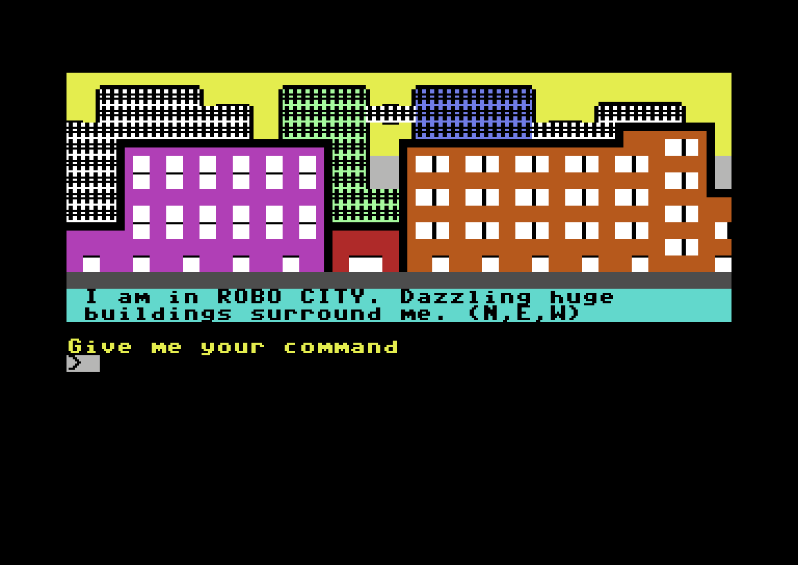 I likhet med The Milky Weigh fra del 3, er dette et spill fra programvareklubben 64 Tape Computing. Som nevnt sist ble disse kassettene distribuert i Norge av Datacompaniet, og jeg vet at et av spillene fra samme kassett, Ellak’s Tomb, ble oversatt til norsk. Så kanskje det også eksisterer eller har eksistert en norskspråklig versjon av Robo-City. Du får gi lyd fra deg om du vet noe.