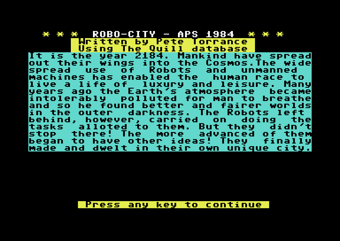 Robo-City er et teksteventyrspill laget i forfatterverktøyet The Quill (som det også finnes en norsk versjon av). Det finner sted i en fjern fremtid, lenge etter at menneskene har forlatt jordkloden på grunn av all forurensingen. De etterlot seg imidlertid en gjeng roboter, som etter hvert har skapt en sivilisasjon. Spillet starter like etter at et cruise-romskip har fått problemer og nødlandet på Jorden, der mannskapet har blitt drept og hedersgjesten – grevinne Andromeda – har blitt kidnappet. Du har ankommet med ditt eget romskip, og må redde Andromeda.