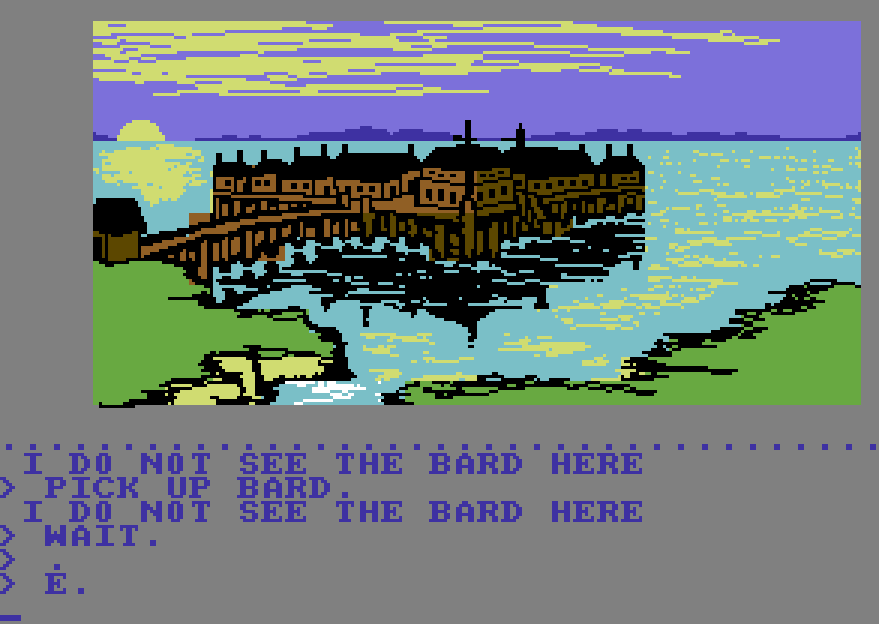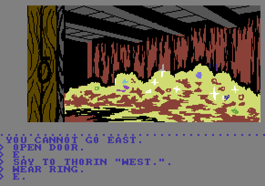 Når det er sagt, har The Hobbit store mengder sjarm i behold, og jeg tør vedde på at det er flere enn meg som føler at de har noe ugjort i spillets nedstrippede manifestasjon av Middle Earth. Hvis dette gjelder deg, anbefales diskversjonen til C64 (utgitt noen år etter originalen), som inkluderer flott SID-musikk, ekstra tekst og lokasjoner, samt noen alvorlig oppdaterte illustrasjoner. Med mindre du er utrolig streng, anbefaler vi også at du har en walkthrough liggende klar i tilfelle du setter deg fast.