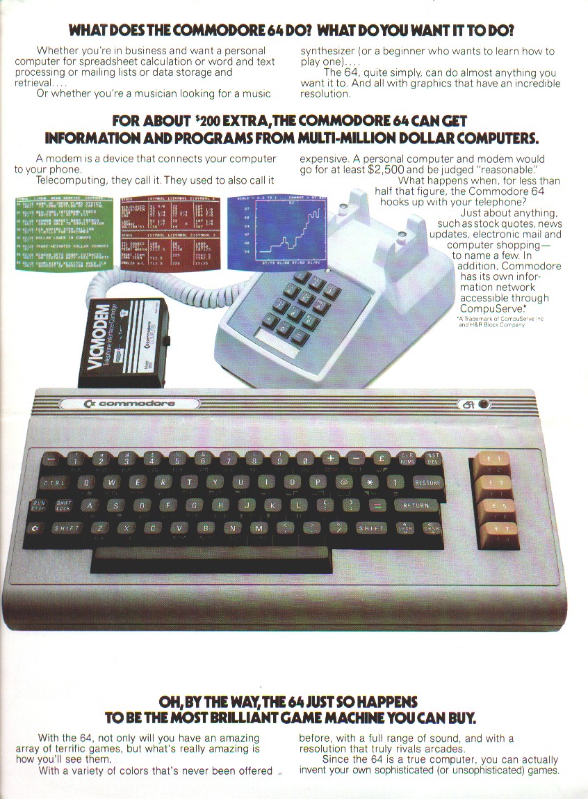 Det er verdt å merke seg at alt reklamemateriell for C64 fra 1982 holder FULLSTENDIG KNYST om maskinens overlegne grafikk og lyd – mest sannsynlig fordi den tilgjengelige programvaren gjorde en så slett jobb av å vise fram disse ferdighetene.