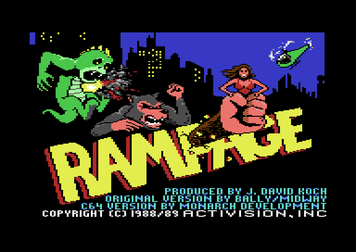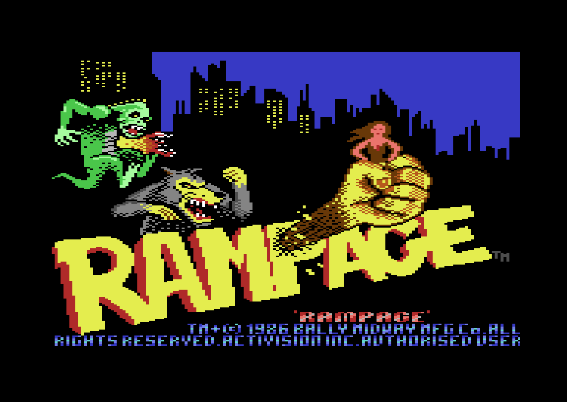 Det var Activision som overførte Rampage til Commodore 64, og her gjorde de noe litt underlig; de lagde to forskjellige versjoner av spillet. En for Europa, og en for USA. Det er den europeiske versjonen som er i samlingen, men jeg må nesten teste den amerikanske også.