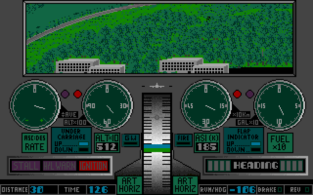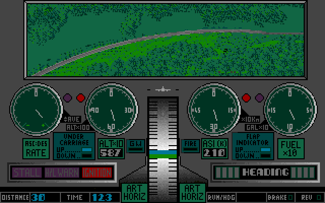 Men over til selve spillet. De første gangene jeg forsøkte meg, klarte jeg ikke å få noen ting til å skje. Men å spille en flysimulator uten manual er jo generelt håpløst, så løsningen var å finne manualen. Ved å følge instruksjonene der klarte jeg – etter mange forsøk – å få min Vickers 737 opp i lufta. Et par forsøk til, og jeg overlevde lenge nok til å komme opp i riktig høyde til at spillet bestemte jeg kunne cruise. Poenget er så å snu, og lande. Akkurat det fikk ikke jeg til.