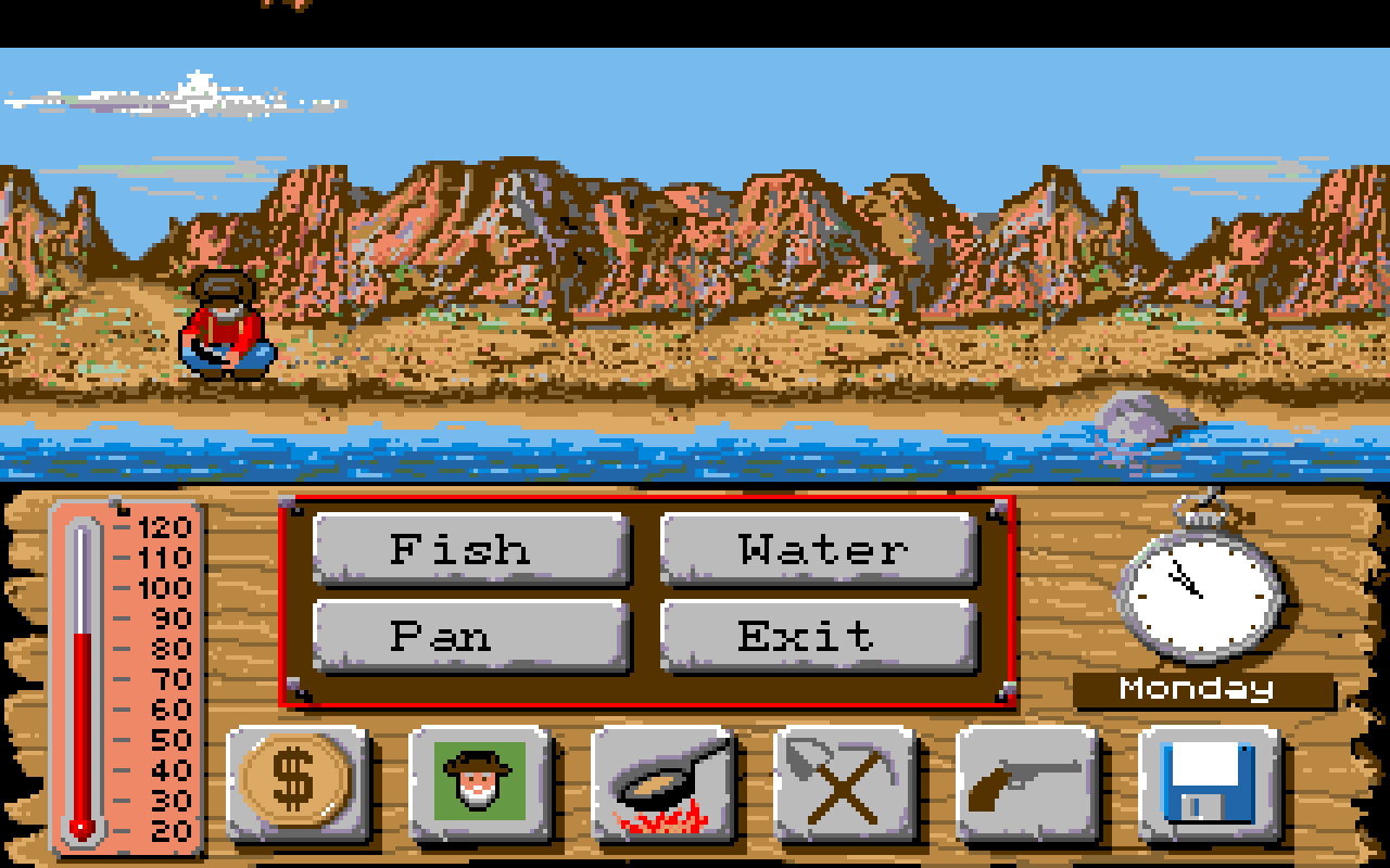 Jo, ganske bra, faktisk. Han startet med den lille tjukkasen midt i byen, stakk innom butikken og plukket med seg en gullvaskepanne, fiskeutstyr, og tre tomme vannflasker. Deretter gikk turen ned til elva, der det viste seg at fisking med joystick var litt vanskelig, men greit nok til å få en ok middag. Fylte opp tre vannflasker og prøvde lykken på å vaske litt gull. Dette gikk overraskende bra, og deretter satt man turen tilbake til han fyren i byen som kjøper gullet. Så oppdager Retrogamingpappa at et barn begynner å våkne litt, og rutinert som han er trykker han på knappen «Save» og får tidenes åpenbaring. For å kunne lagre må man ha et tastatur, noe THEA500 Mini har, men det fungerer jo ikke! Trøtt, småsur og litt oppgitt tar Retrogamingpappa kveld.