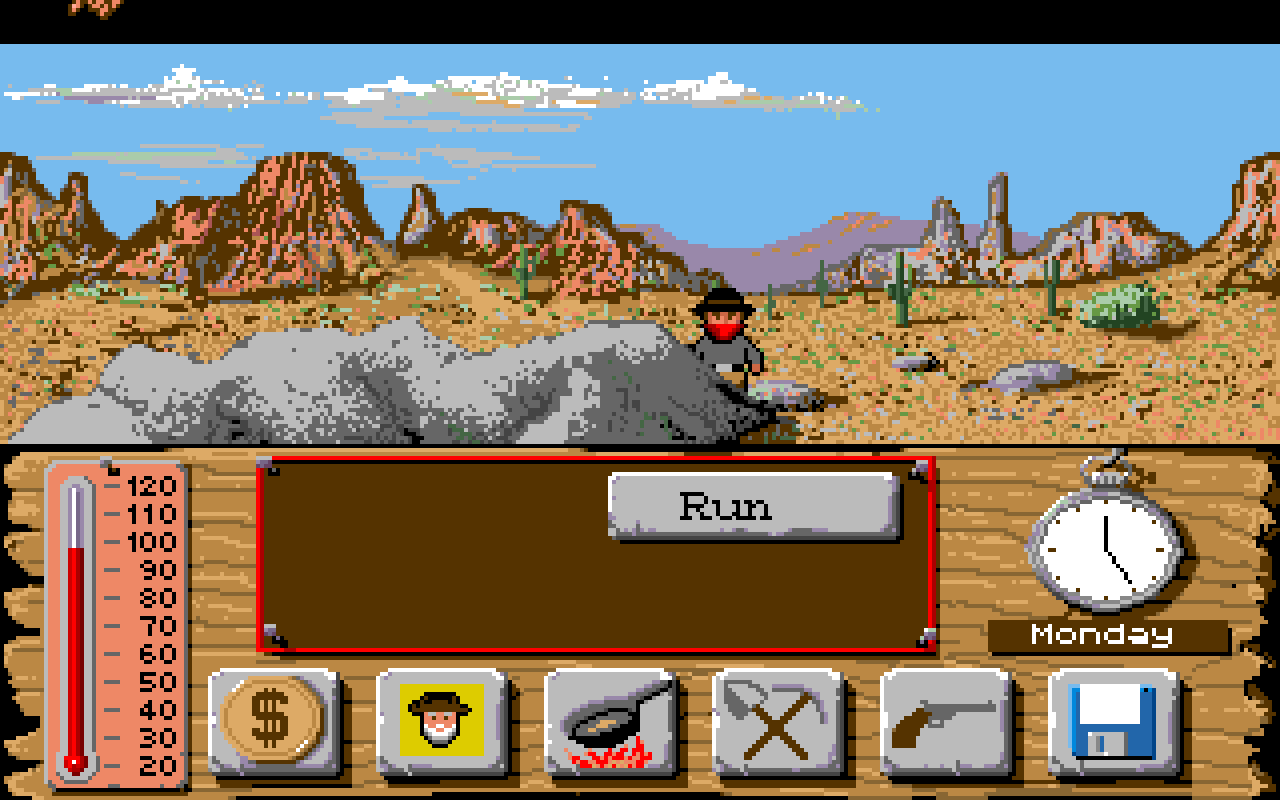 Etter hvert kan det bli ganske så kjipt å havne i en situasjon der du må starte på nytt, det vil si dø av blyforgiftning eller vann/matmangel. Det finnes flere forskjellige lokasjoner rundt deg, og du beveger deg mellom dem via et kart som viser din del av verden, der du styrer en liten prikk til å bevege deg mot dit du ønsker å gå. Dette fungerer utmerket, frem til du plutselig blir angrepet av sinte banditter eller tidligere landeiere. Hvis du blir skadet, men overlever trefningen bør du ta turen innom landsbylegen. Samme om du blir bitt av en slange. Banken drar du innom om du vil sette inn eller ta ut penger. Og går du innom avisen, så ja, du skjønner.