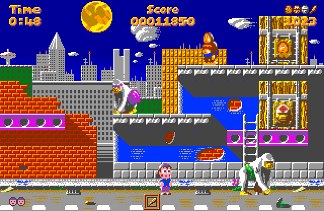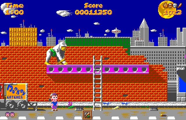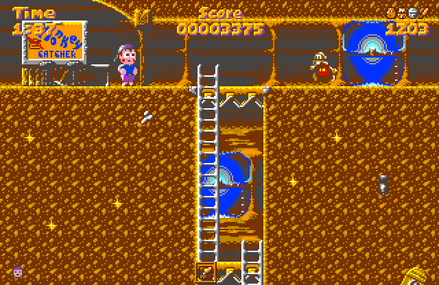 Jeg hadde faktisk aldri hørt om Catch ’em før – og ja, jeg er arrogant nok til å tro at jeg kjenner til det aller meste av spill som er noe å kjenne til på Amiga – men det er et tyskutviklet plattform-/hjernetrimspill der du må fange aper som løper løpsk. Dette gjør du typisk ved å først distrahere dem (ved hjelp av korrekt objekt, som du enten kan finne på brettet eller i lastebilen din), og så smacke dem i hodet med en baseballkølle. Så håver du dem inn og tar dem tilbake til buret deres. PETA hadde nok ikke likt dette spillet.