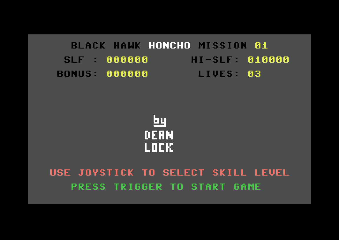 Black Hawk ble i sin helhet programmert og designet av Dean Lock, og gitt ut til Commodore 64 og ZX Spectrum i 1984. Start opp spillet, og du får velge mellom to vanskelighetsgrader: Rookie og Honcho. Da vi spilte dette på Commodore 64 forstod vi ikke hva noen av valgene betydde, men vi fant fort ut at Rookie var enklest å spille, og det trengte vi!