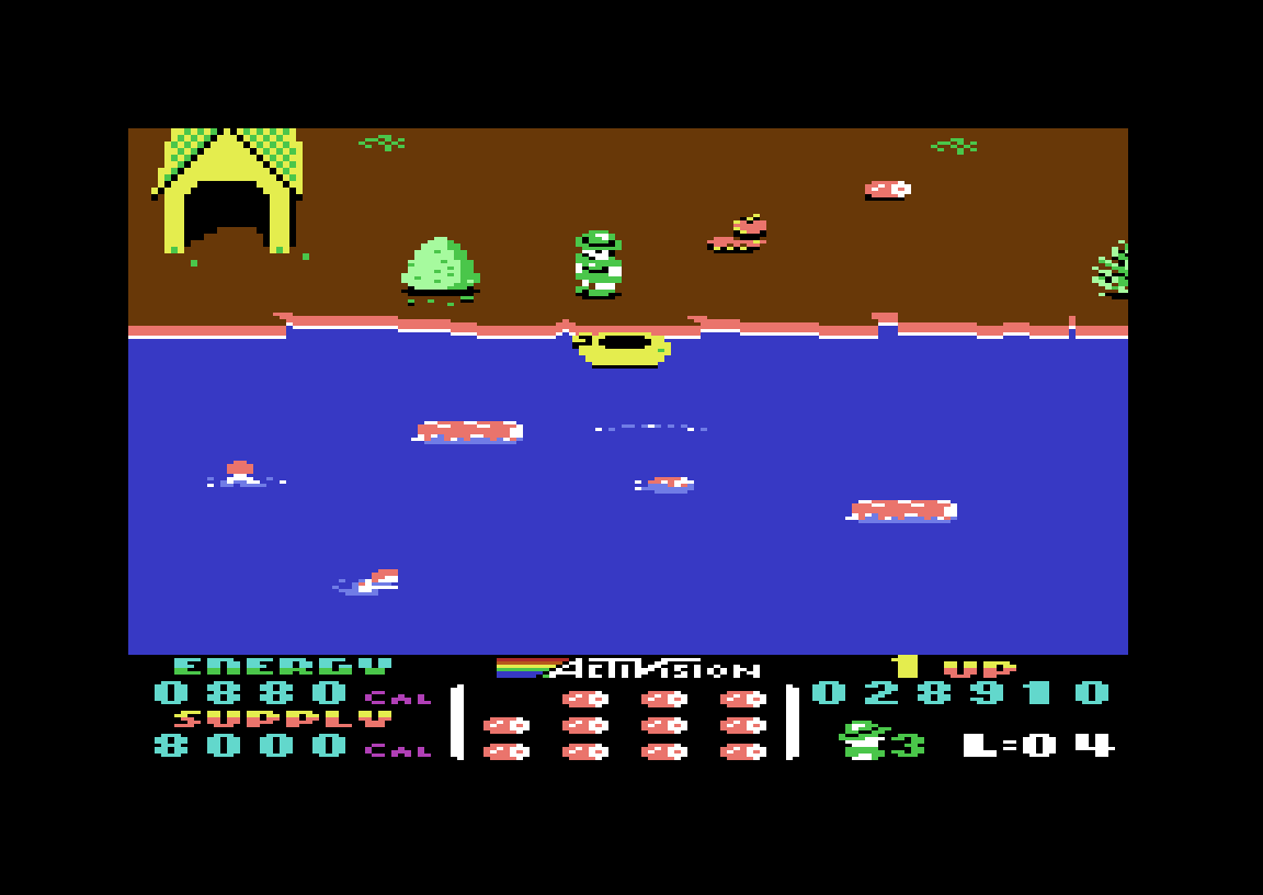 I elva er det slanger, fra andre brett og utover, som biter hull i gummibåten om du kommer for nærme, men disse kan du tvinge til å dykke ved å kaste ut en form for antislangemiddel. Dette er imidlertid ikke gratis; det koster deg kalorier, som du ellers kontinuerlig bruker bare ved å leve. Heldigvis kan du få påfyll i parkvesenets bu, om du rekker å vende tilbake dit. Og ikke maurene som dukker opp på senere brett har stukket av med forsyningene dine allerede (maur som stjeler mat er jo som alle med litt tegnefilmerfaring vet en av de virkelig store farene i nasjonalparker). Heldigvis kan du sparke maurene, og ta tilbake maten.