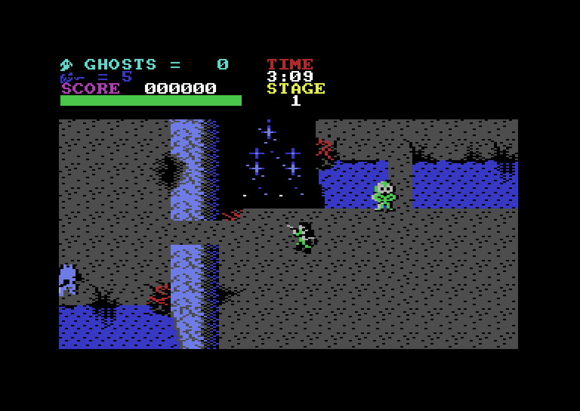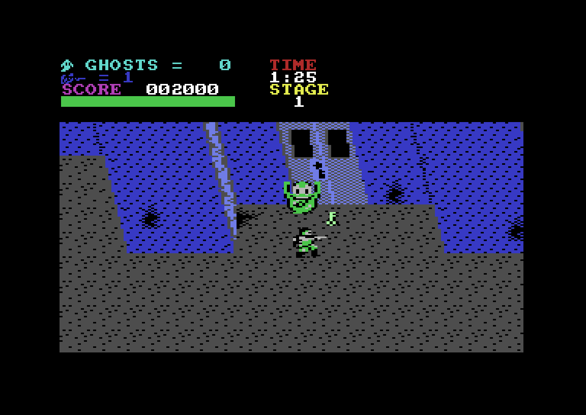 Her er vi nemlig i helt tradisjonelt skrollende skytespill-territorium. Hadde det ikke vært for tittelskjermen og en solid versjon av Ghostbusters-temaet som spiller og går hele tiden, er det slett ikke sikkert jeg hadde skjønt det var et Ghostbusters-spill i det hele tatt, for det handler bare om å løpe rundt og skyte ting. Skjermen skroller i fire retninger, og poenget er å komme fra starten av nivået til slutten, der en «boss» venter og må kverkes. Masse spøkelser, zombier, vampyrer og andre lugubre greier prøver å hindre deg, mens du hjelpes av diverse bonuser som kan plukkes opp. Du kan både skyte og bruke protonstråle, men sistnevnte har du begrenset tilgang på.