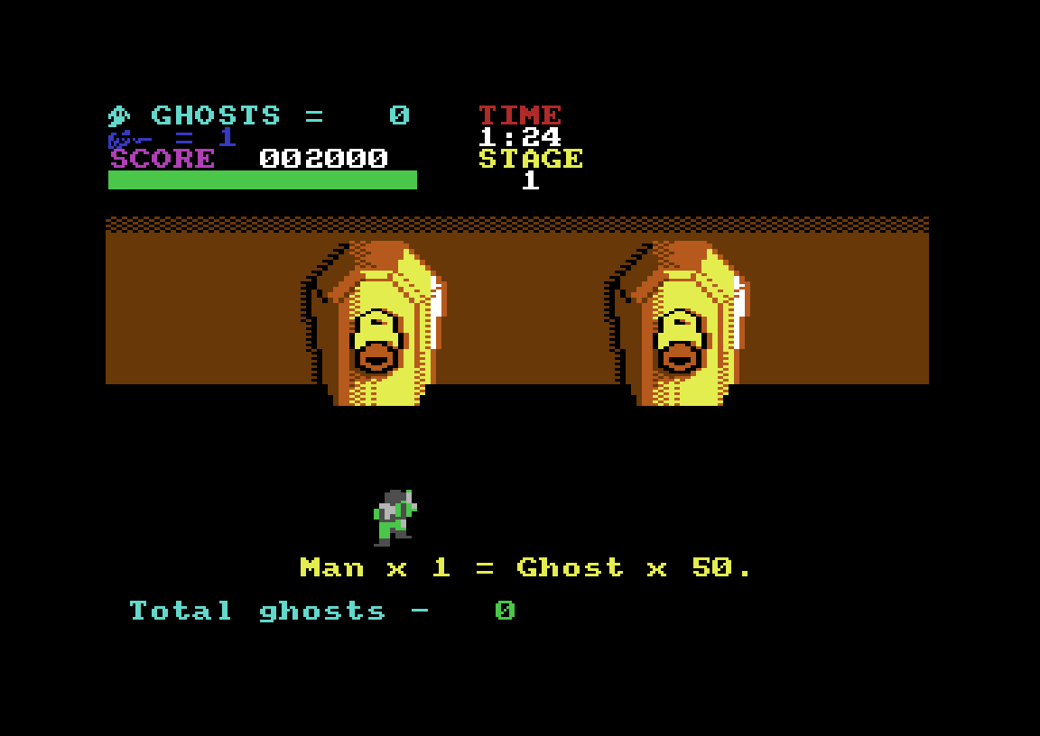 Dette er Big Box-pakkens andre Ghostbusters-spill fra Activision. Mens det første var basert på originalfilmen, er dette basert på animasjonsserien The Real Ghostbusters – eller nærmere bestemt Data Easts arkadespill basert på animasjonsserien The Real Ghostbusters. Jeg har aldri sett serien eller spilt arkadeoriginalen. Det jeg kan si er at hvis Commodore 64-utgaven er tro mot arkadeversjonen, er det lite tvilsomt noen av dem har særlig mye til felles med TV-serien.