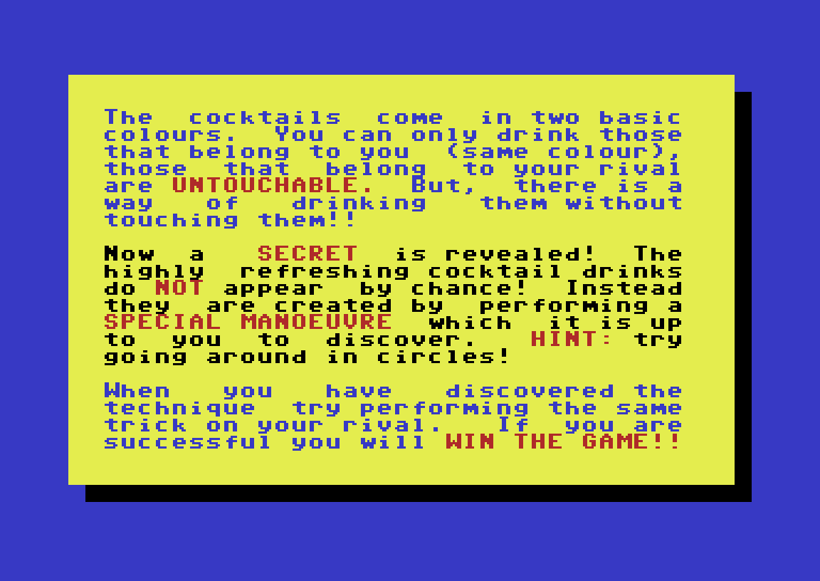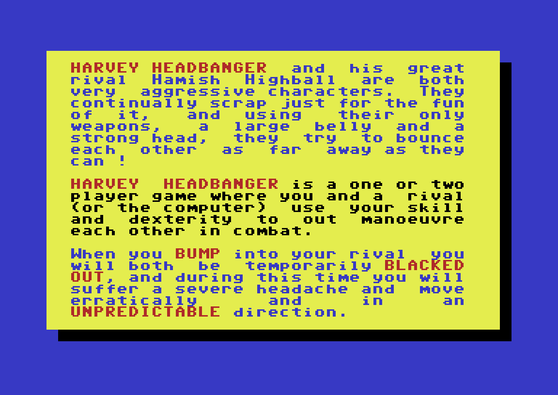 Spillet er en tvekamp mellom Harvey Headbanger og kameraten hans, Hamish Highball. De er tjukke akrobater som slenger seg rundt på et slags rutenett mens de fargelegger rutene i hver sin farge. Om en av dem lager en sløyfe uten at den andre klarer å hindre ham, dukker det opp drinker i det omringede området. Disse er dødelige for motspilleren, men greie å ha for den som har laget dem. Så da er poenget å prøve å lage så store sløyfer som mulig, mens man unngår at motspilleren får rotet dem til.