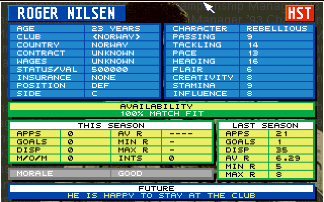 CM93 var et artig spill, men lastetidene var grusomt lange. Det beste managerspillet i 93 var i mine øyne Premier Manager 2, som også var ute til Amiga. Musikken i DOS-versjonen er 100 ganger bedre enn Amiga-versjonen for en gangs skyld, så Amiga-fans har vel helt glemt det spillet.