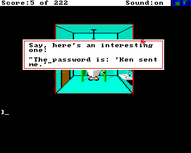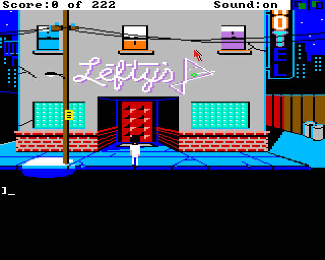 Uansett, vi starter med vår antihelt utenfor Leftys bar. Etter å ha gått bort til døra og skrevet «Open door» kommer vi oss inn. Der venter en bar. Ikke overraskende. Da er det bare sette seg ned, og skrive «Ken sent me» og så vinner vi spillet om jeg husker rett.