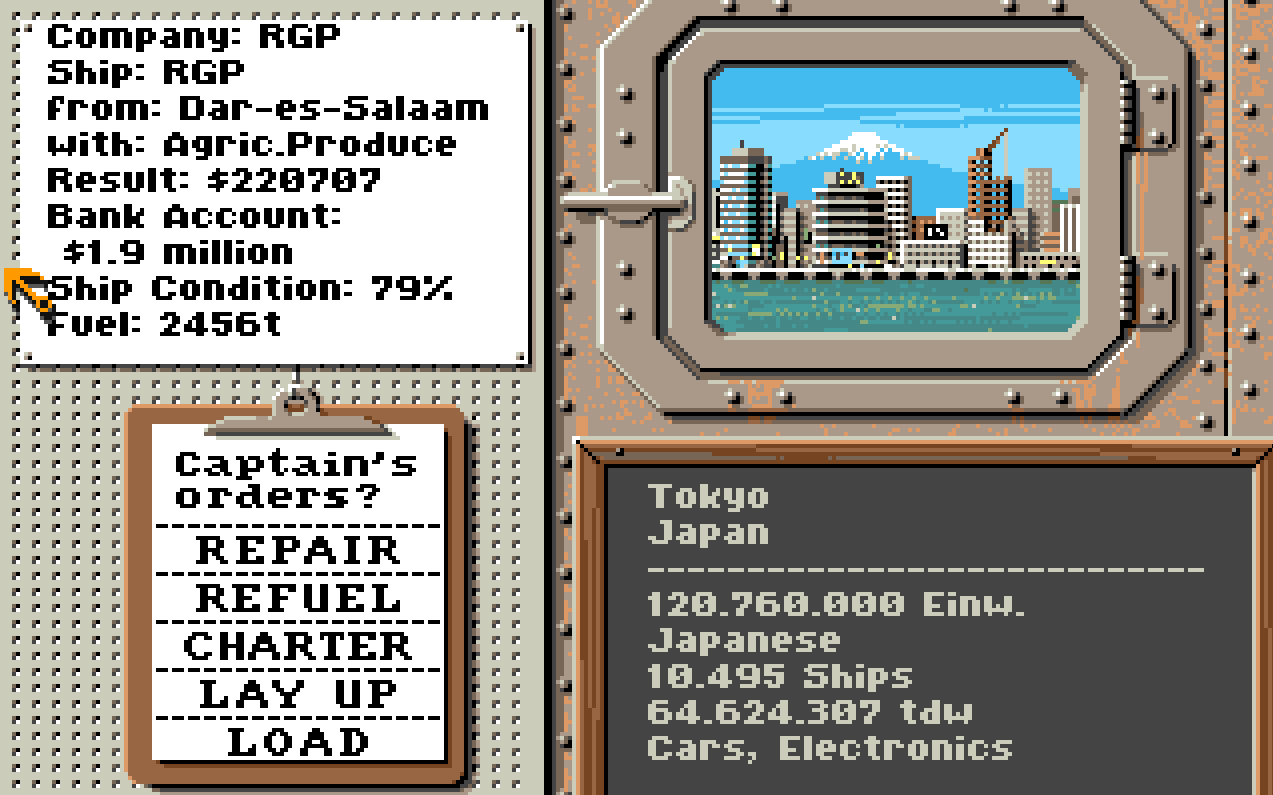 Hva er vel enhver kåring uten en skikkelig skipsmegler-simulator? Dette var det ungene var helt gale etter på 90-tallet. Enhver guttedrøm var nok å kunne kjøpe et lettrustet frakteskip for så å gå i rute mellom Dar-Es-Salaam og Tokyo med korn og elektronikk. Ja, det er jo det spillet går ut på. En eller flere spillere i hot-seat, du velger navn på shipping-imperiet ditt, hovedbase og kjøper skip som du sender ut i verden. Du får jo også tildelt et kontor når du starter. Dette var ofte en skuffelse.