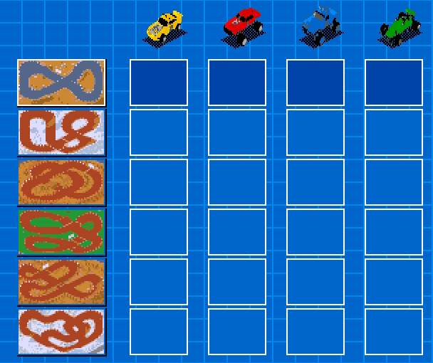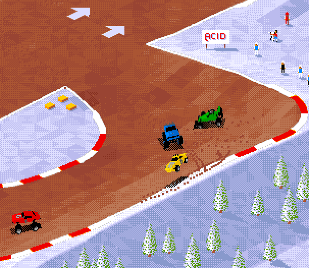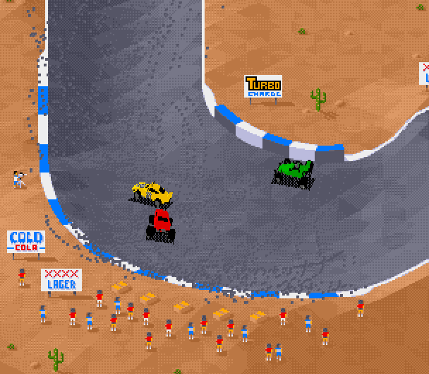Hva var dette da? Var dette spillet med masse små biler som hopper rundt på en liten grusbane? Mener at det var ganske morsomt. Tro om ikke Retrogamingpappa og Amiga Amigo brukte ekstremt mange timer på dette i barndommen? Kunne man velge bil her, eller fikk man bare en farge? Dette er nok også best i mulitplayermode. Tro om det var noen enplayerkampanje?