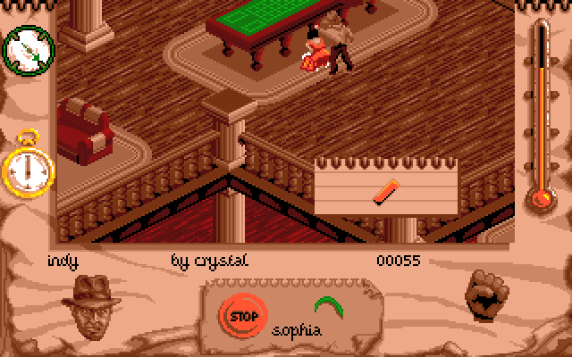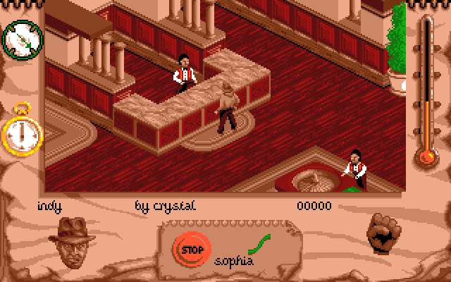 Kontrollene er helt forferdelige. Møter Indy i et isometrisk landskap. Egentlig ikke landskap, det er mer en Hotell/Casino-lobby, men Indy vises isometrisk. Han styres ved at du tar joysticken mot høyre eller venstre, og snur seg til sin høyre eller venstre. Du får Indy til å gå fremover ved å ta joystiken opp. Og tar du den ned, så slår du naturligvis.