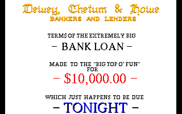 Vi er på sirkus. Sirkusdirektøren får plutselig en faktura på 10,000,000 fra Big Greedy Bank. Forfallsdatoen er i kveld! Vi må samle inn nok penger for å reddee sirkuset! Heldigvis har vi mulighet til å gjøre dette ved å delta i 6 konkurranser. Og får vi nok penger i hver av disse, så klarer vi å redde sirkuset.