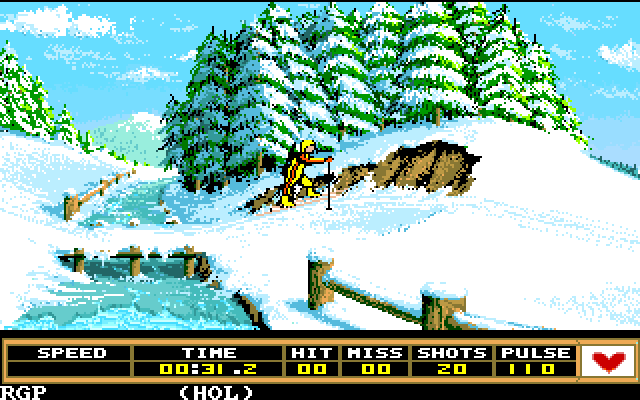 Skiskyting. På en THEA500 Mini. Med den medfølgende controllerpadden. I gamle dager hadde man tatt tak i en litt løs joystick, holdt den i basen og ristet løs for å få god fart på i langrennssporet. Det går ikke med den medfølgende kontrolleren. Når man går langrennsdelen bortover, må man trykke på høyre så venstre, og gjenta. Retrogamingpappa utviklet prolaps i venstre tommel før vi i det hele tatt kom til første skyting. Det er nok en grunn til at dette spillet normalt sett ikke følger med THEA500 Mini. Og mitt tips til deg akkurat nå er, ikke prøv. La dette være et minne fra når du var 8 år og samlet en gruppe med jevnaldrene snørrette drittunger nede i kjellerstua til han litt rare onkelen din og spilte livet av dette. Takk for nå kan vi si til Epyx Winter Games.