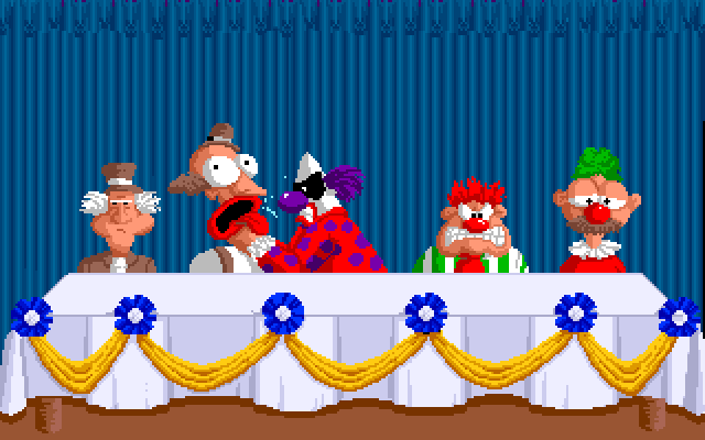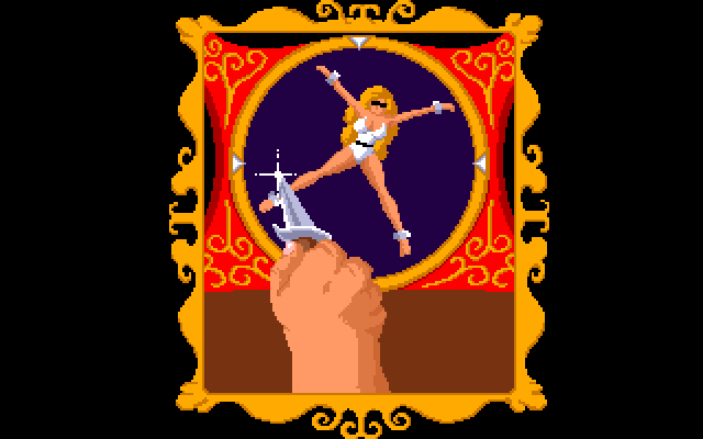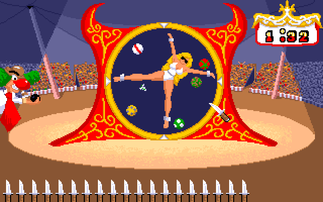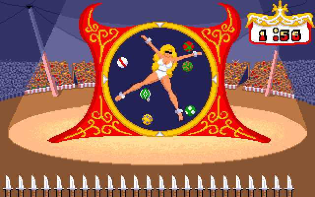 Nå kan vi egentlig se langt etter å beholde sirkuset. Vi skal her kaste kniv på ballonger mens en halvnaken person, som jeg tror identifiserer seg som kvinne, spinner rundt foran knivene. OG den der klovnen skal kaste bomber på oss igjen? Håper vi får mye penger neste konkurranse.
