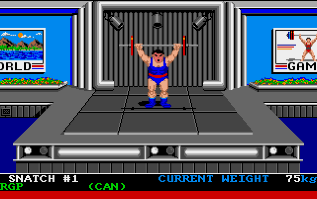 Første konkurranse. Vektløfting. Det utføres ved å ta joysticken opp og ned i rett rekkefølge og med rett timing. Hvilken type vektløfting avgjør også hva du må gjøre. Og vi testet dette på en jobbsamling en gang. Samlet en gjeng med nerder, som kanskje ikke var født da dette spillet kom ut. Satte på World Games og gikk for å hente en øl mangodrikke. På vei tilbake holder gjengen på med vektløfting, og uten å gi noen tips prøver de seg litt frem før de slår av Amiga-en. Det summerer egentlig opp den øvelsen. Litt trist at vi ikke fikk reaksjoner på klippestuping, tønnehopping, okseridning, tømmerrulling, slalom, stokkekast og sumobryting. Men det summerer egentlig ganske godt hvordan dette spillet har holdt seg. Ikke bra.