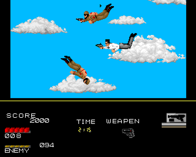 Første del, “fallskjermhopping”. Vår hemmelige agent hopper ut av et fly, men glemmer fallskjermen. På vei ned, dukker det opp av intet andre skumle banditter, som enkelt lar seg skyte ned. Det var for lett…