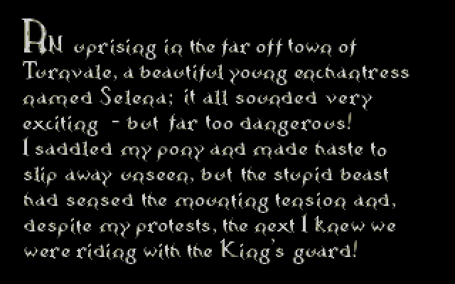 Spillmessig var Hero’s Quest bra, og hadde noen forlokkende quests man måtte klare å løse. Hvem husker ikke Baba Yaga’s Hut? Jeg er ikke helt sikker på det jeg skal fortelle nå, men jeg mener å huske at jeg hadde fått en diger konvolutt i posten en dag, som inneholdt både HQ1, QFG2 (ser du hvor forvirrende det er når en spillserie endrer navn allerede på andre utgivelse?) og Conquests of Camelot, så jeg heiv meg på BMX’en og sykla gjennom skauen og ned til Stian.