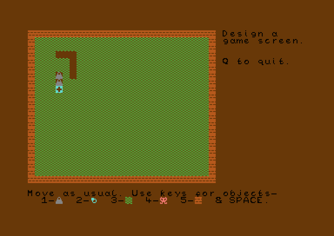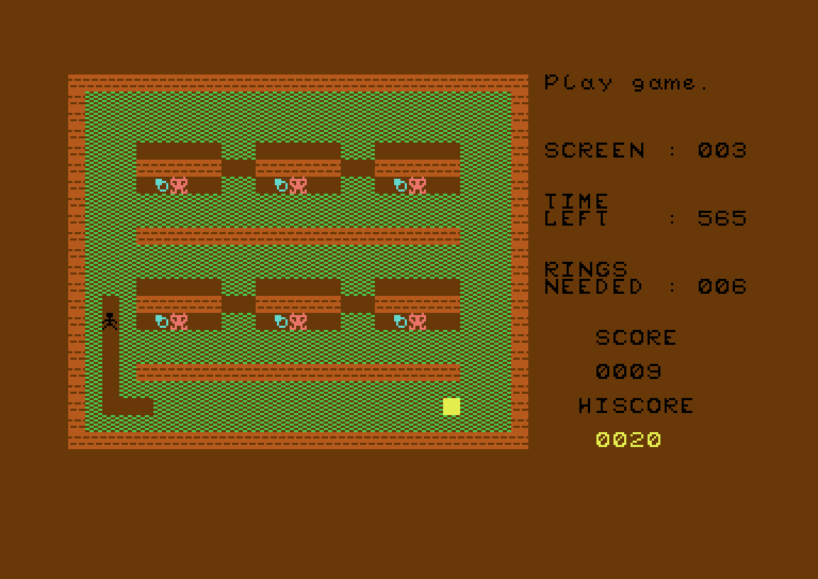 Her har vi en enkel Boulder Dash-klone som bruker omdefinert karaktergrafikk (altså at utvikleren har laget grafikken ved å endre på tegnsettet til maskinen, slik at et utropstegn kanskje ser ut som en stein og et spørsmålstegn kanskje er en strekmann, og der hver «grafikkbit» krever en av de tusen tekstrutene standardskjermen er delt inn i).