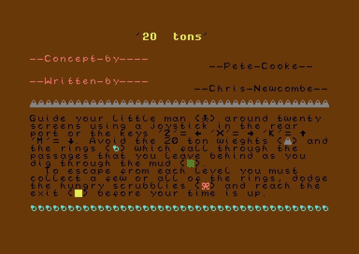Så skal det sies at 20 Tons aldri ble solgt som frittstående spill, i stedet var det opprinnelig med på et nummer av 64 Tape Computing. Dette var regelmessig utgitte kassetter fulle av (eksklusive, tror jeg) programmer og spill. Hvis du har lest Masters of Doom om id Softwares begynnelse, kan du tenke deg 64 Tape Computing som en Commodore 64-variant av Gamer’s Edge.