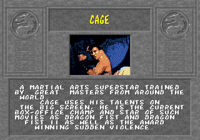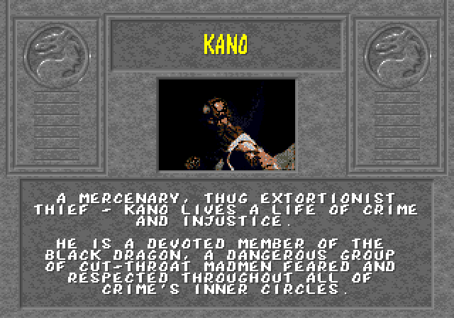 Mortal Kombat er et kampsportspill for en eller flere spillere. Movesa til de forskjellige spillerne du kan velge har blitt filmet og på magisk vis overført til Amiga-disketten din.