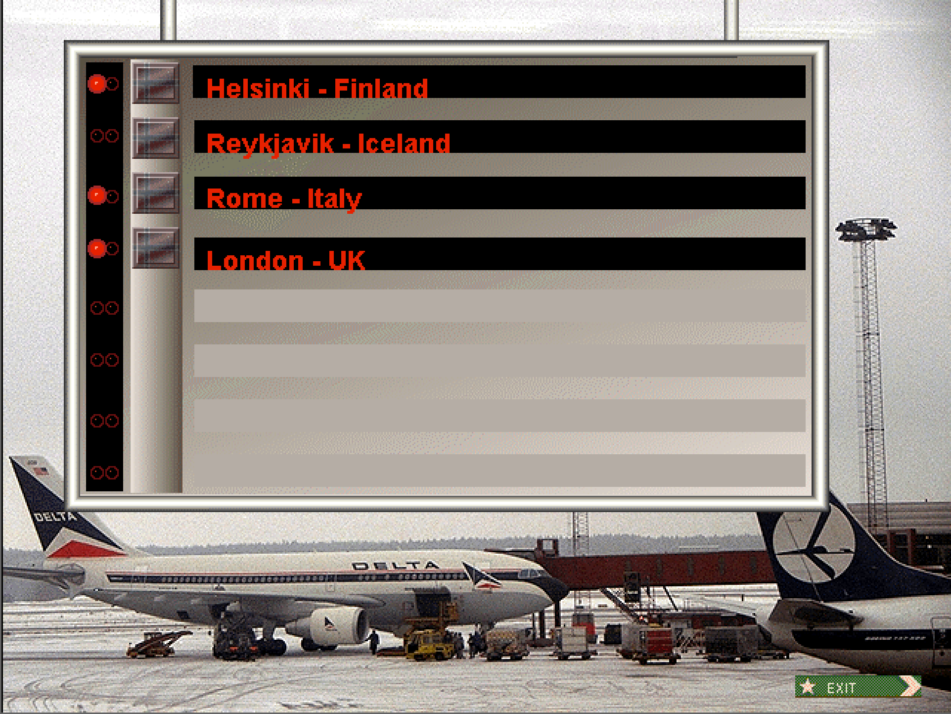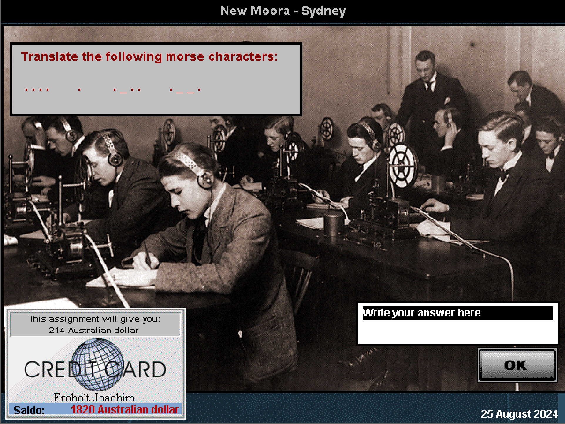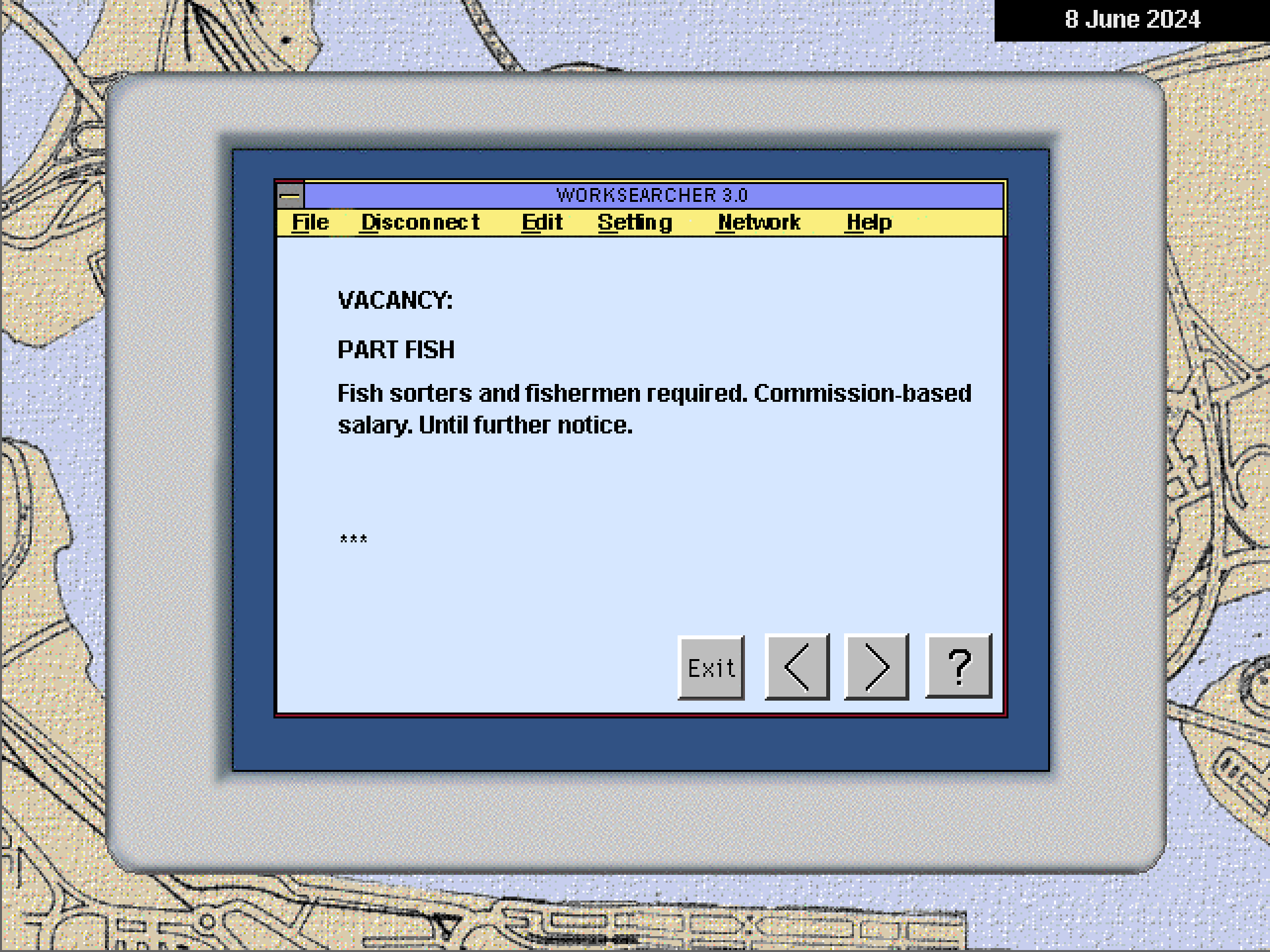 For å få jobb må du først ta inn på et hotell, og det innebærer merkelig nok at du må svare på en haug av spørsmål om landet du befinner deg i. Noen har svaralternativer, andre må du skrive inn svarene på selv. Sekvensen avsluttes ved at du får opp et kart, og må identifisere så mange byer som mulig innen en tidsfrist. Hvordan du gjør det i denne delen av spillet avgjør hvor mange jobbtilbud du kvalifiseres for i byen.