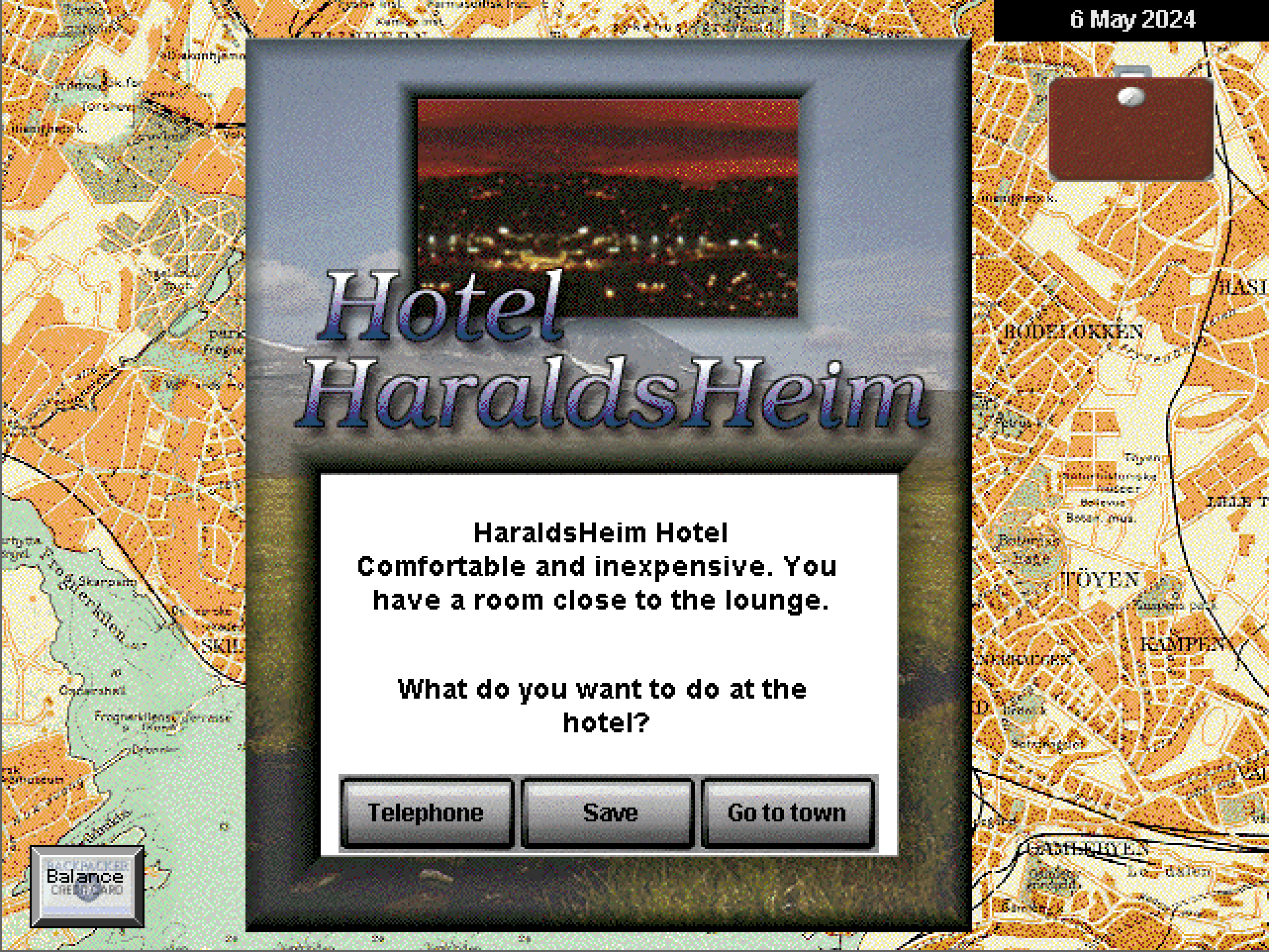 I utgangspunktet vil ikke Backpacker finne på å kjøre på en moderne Windows-versjon, men det kan selvsagt spilles via emulatorsystemer som PCEm. Om du ikke ønsker alt bryet med å sette opp noe slikt, finnes en snarvei i form av WineVDM, som jeg har skrevet noen ord om før. Med dette installert er det bare å legge Backpacker på harddisken og dobbeltklikke på Backpacker.exe, og så kjører spillet. Ikke helt perfekt, riktignok, for det er ingen skalering av skjermbildet som dermed blir ganske lite på en moderne skjerm, og jeg fikk stadig opp feilmeldinger i bakgrunnsvinduet til emulatoren. Men jeg merket ikke noe galt med selve spillet, og spilte det i flere timer uten problemer.