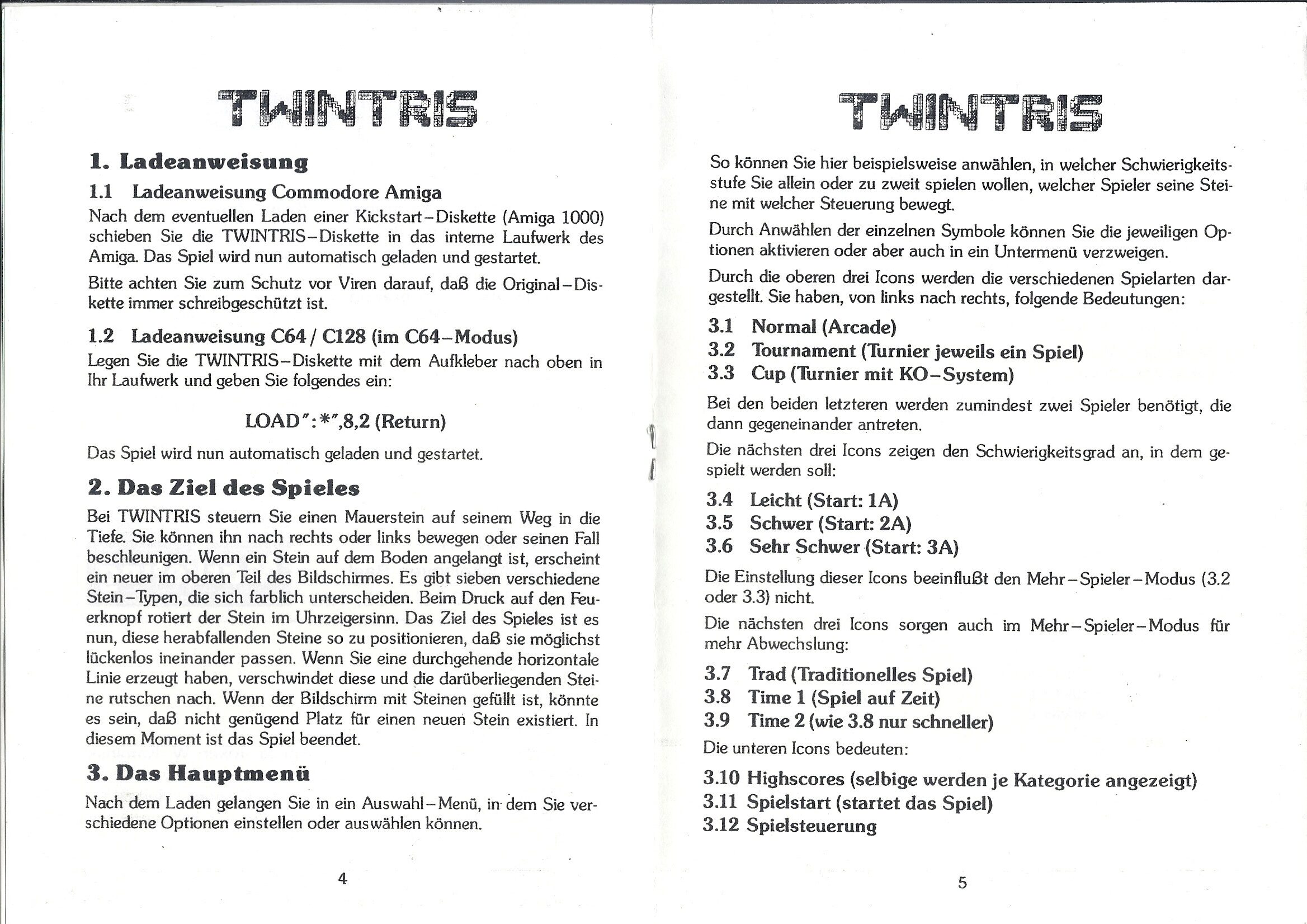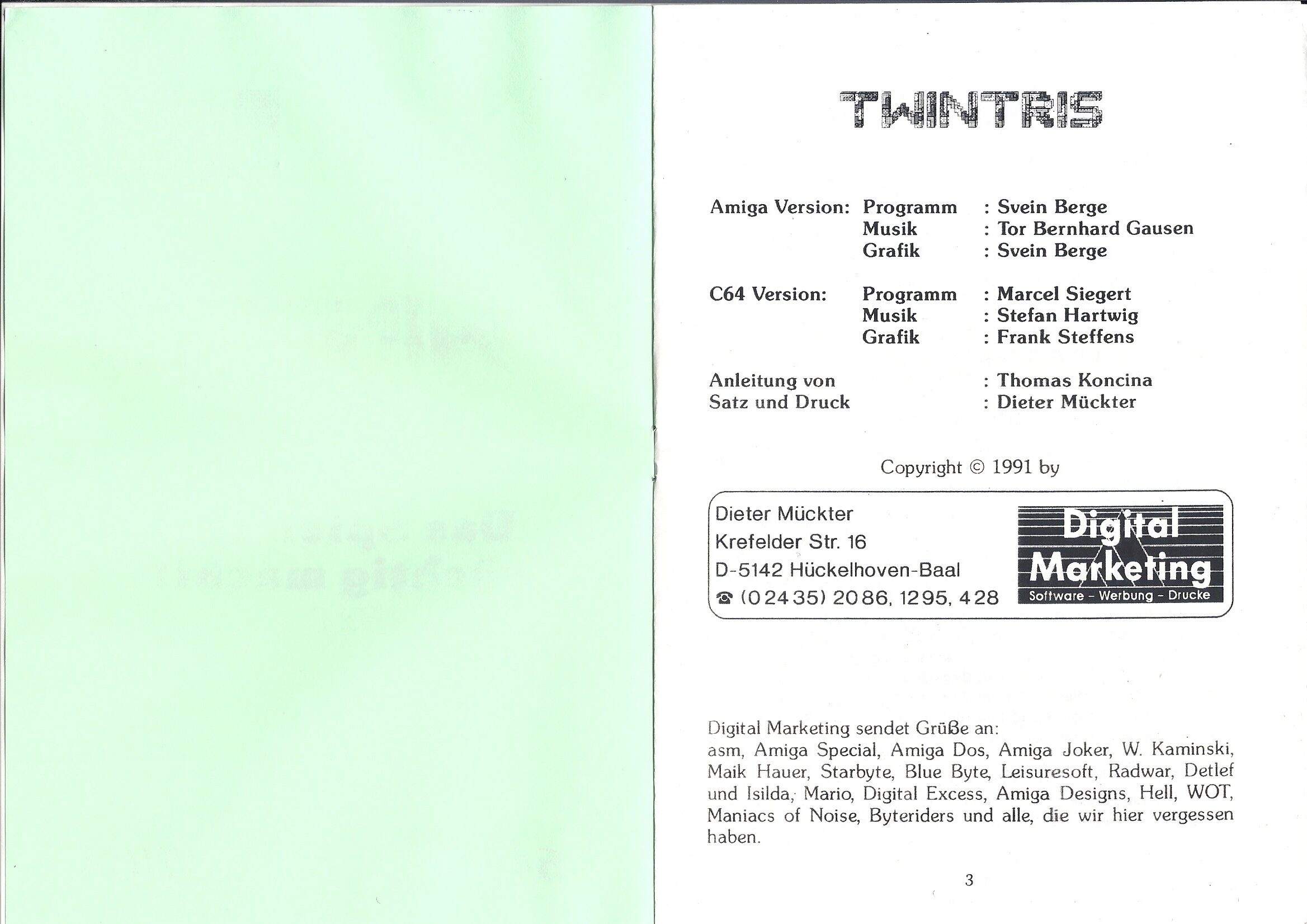 Da Berge (altså Twintris-Berge, ikke Röyksopp-Berge) sendte oss litt digitalisert fysisk materiale fra spillutgivelsen, fikk vi oss en aldri så liten overraskelse. Den tyske manualen, som du kan ta en titt på under, inneholder nemlig informasjon om en Commodore 64-versjon. Ikke bare det, men informasjonen er temmelig detaljert, med blant annet en liste over medvirkende utviklere.