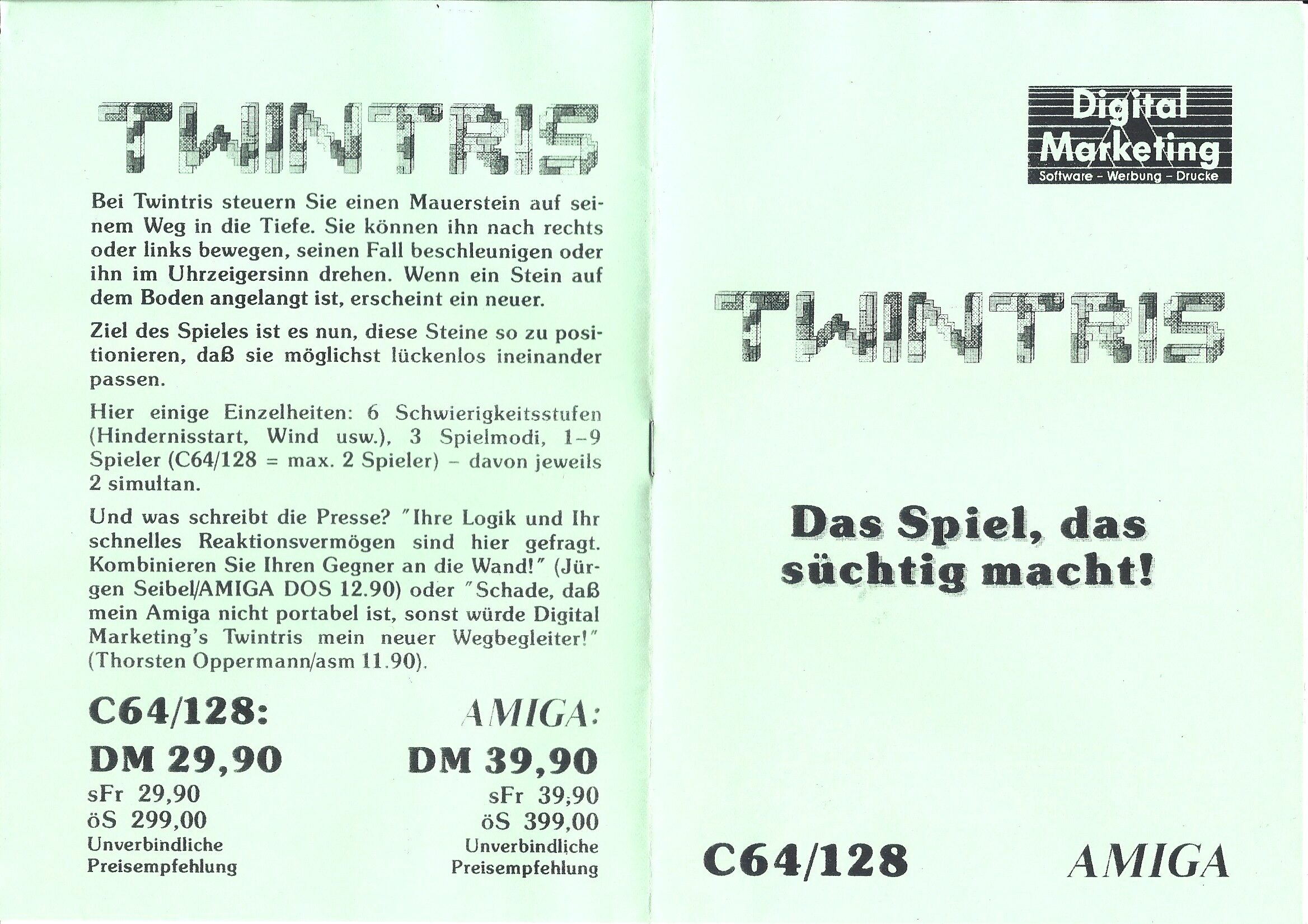 I 1990 lanserte den tyske utgiveren Digital Marketing et Amiga-spill ved navn Twintris. Det var i bunn og grunn et forsøk på å gjenskape det legendariske puslespillet Tetris, men her var det spesifikt Ataris arkadeversjon av Tetris som var inspirasjonskilden. Dermed var mye av fokuset på at to spillere skulle konkurrere mot hverandre samtidig, via delt skjerm.
