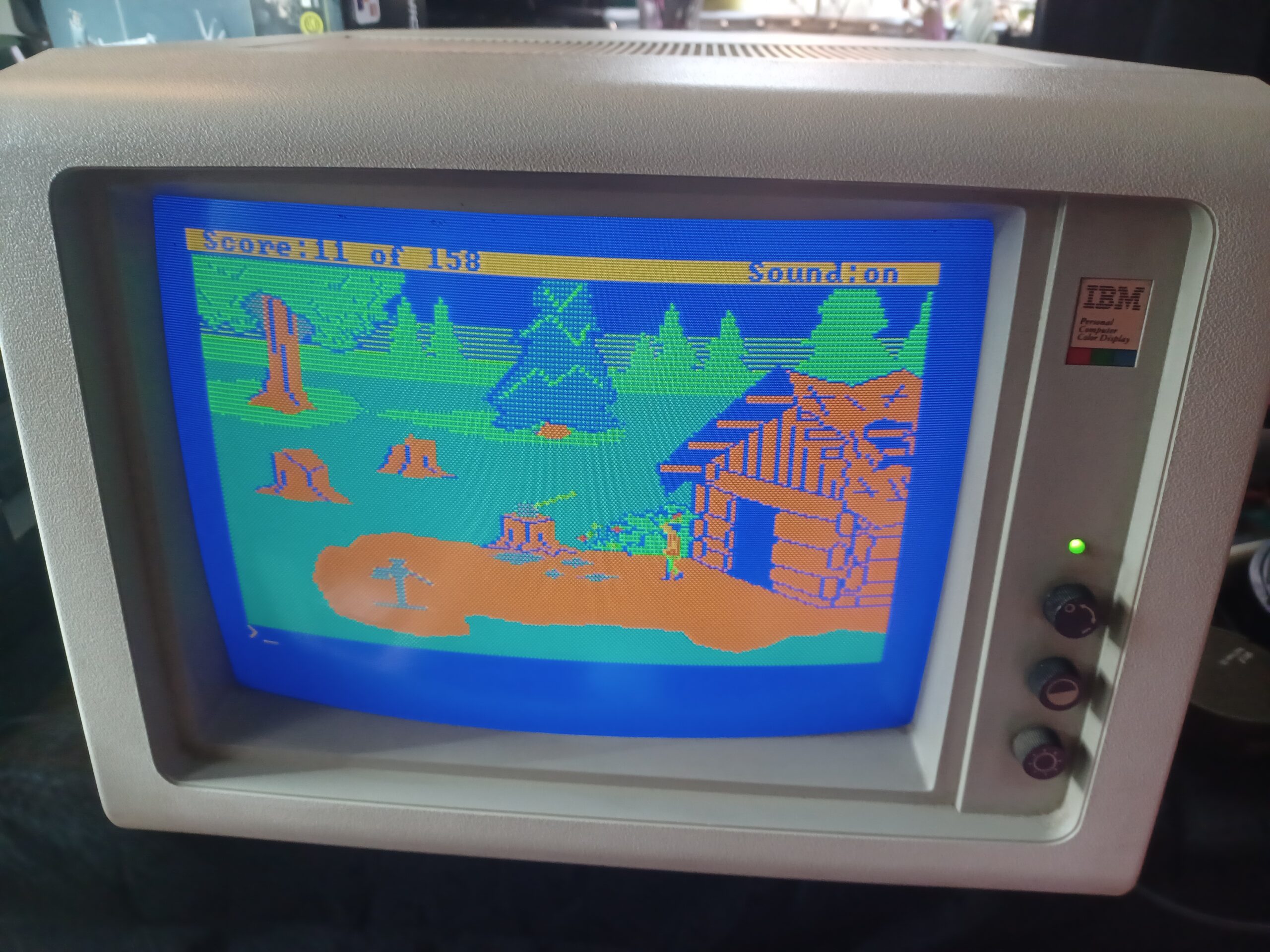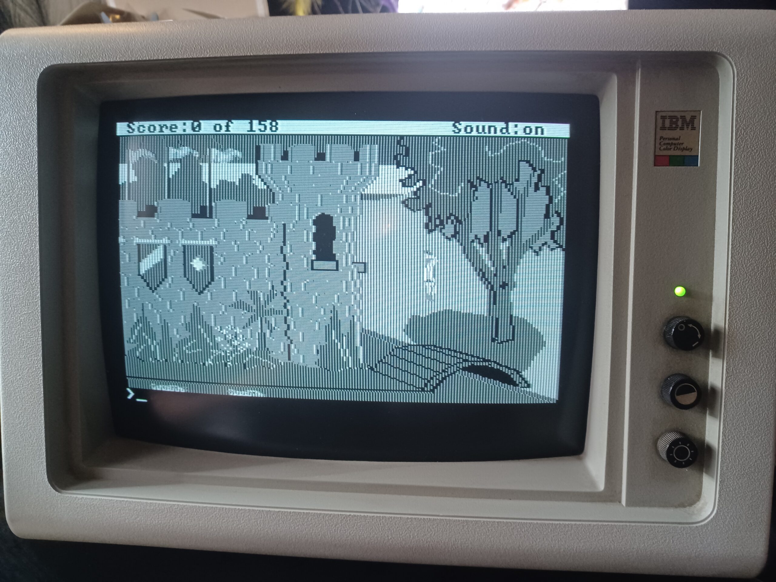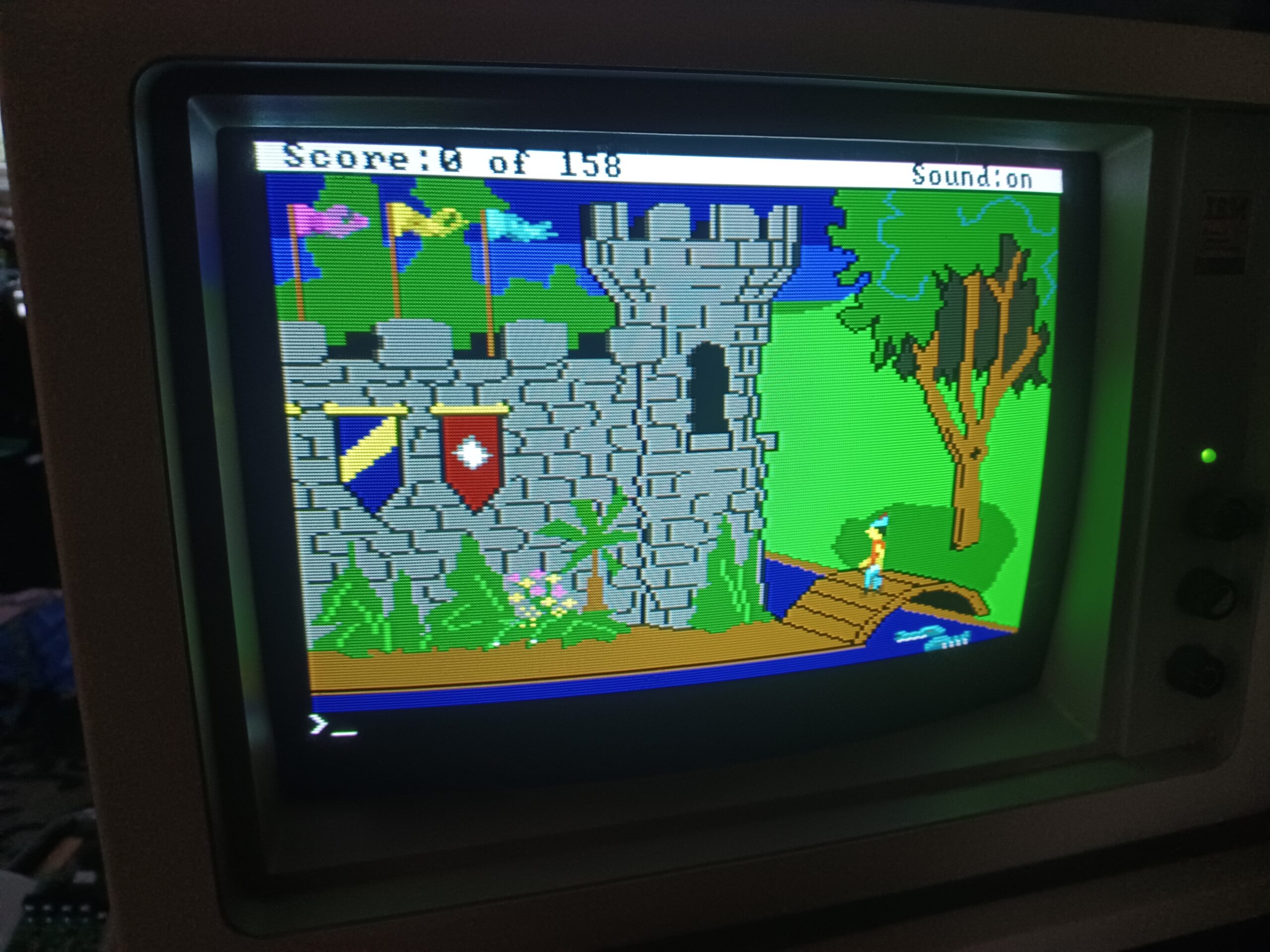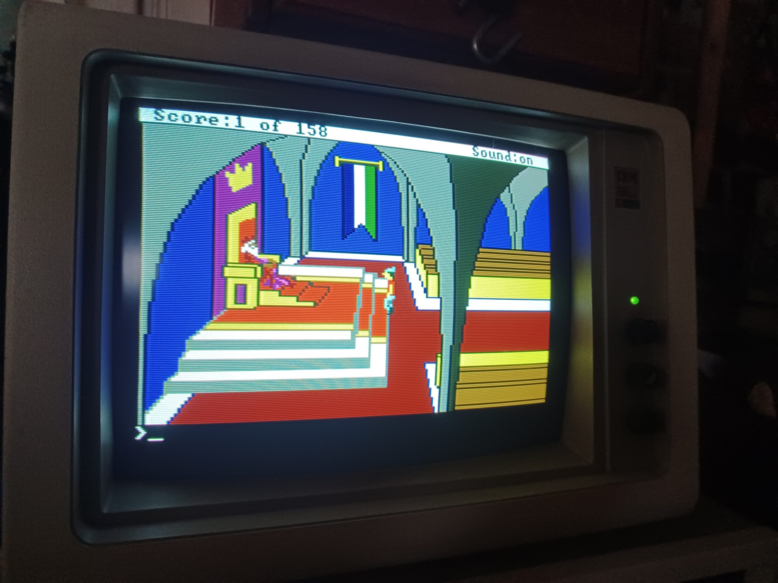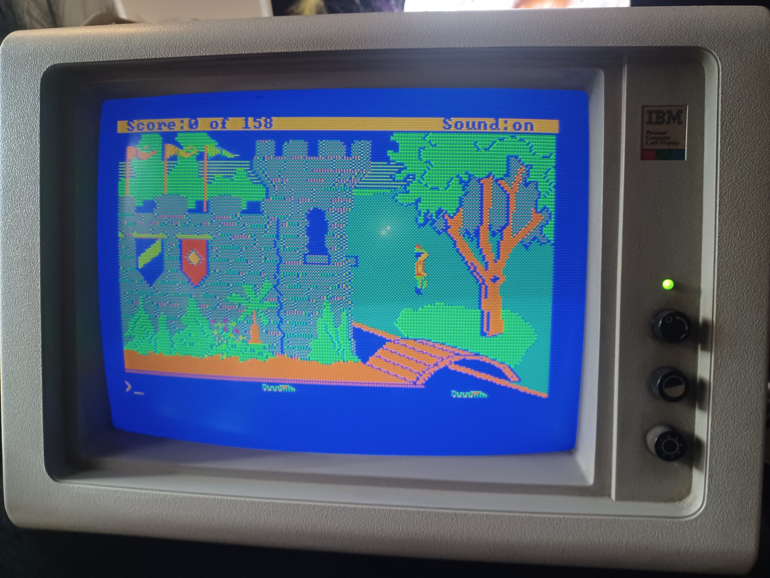 Her er noen bilder av spillet på en IBM PC. Det testes i litt forskjellige grafikkmoduser (først hadde maskinen kun CGA-kort, men et EGA-kort ble satt inn senere):