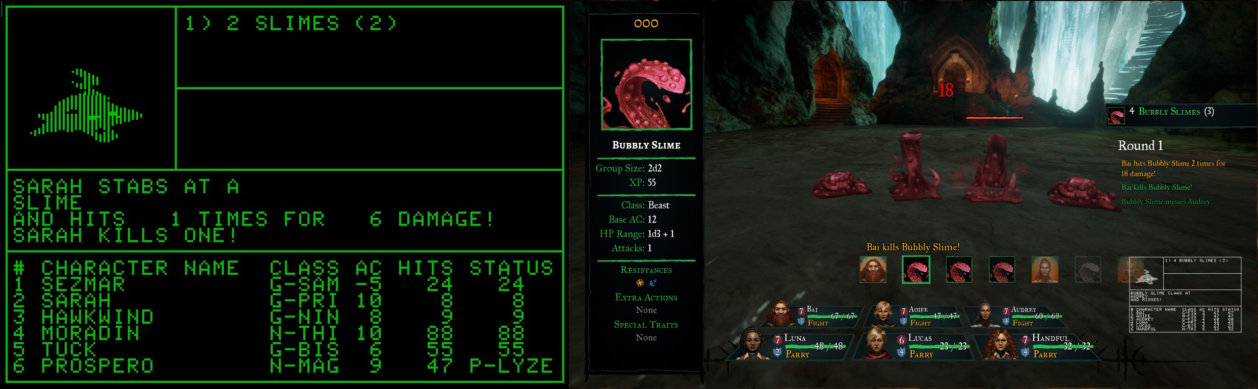 Grensesnittet kan ellers være rimelig knotete, og jeg skulle ønske at utviklerne hadde gjort enda flere moderniseringer her for å gjøre det lett å få tilgang på informasjon raskt. Forventede ting som enkel sammenligning mellom utstyr du har plukket opp og det du bruker finnes ikke, og du kan ikke engang se hvor mange penger du har mens du er i grottene. Å velge mellom ulike gruppemedlemmer er mer pes enn det burde være, og du må stadig veksle mellom bruk av mus og tastatur om du vil effektivisere spillingen. Jeg er glad for at spillmekanismene er trofaste mot de i originalspillet, men jeg ser ikke hvorfor grensesnittet generelt trenger å være så knotete som det er.