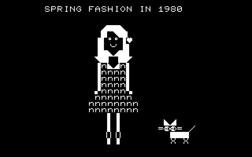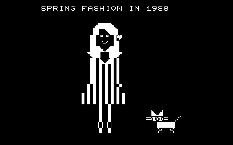 Så her får vi et dame og en katt, og ved jevne mellomrom skifter damens kjole grafikk. Samtidig pipes det ut noe klassisk musikk – Til Elise, og et annet stykke jeg ikke husker navnet på her og nå. Jeg skal prøve å være snill mot disse gamle programmene i denne serien, men maskinens variant av PC-piperen kommer jeg til å ha ekstremt lite tålmodighet med.