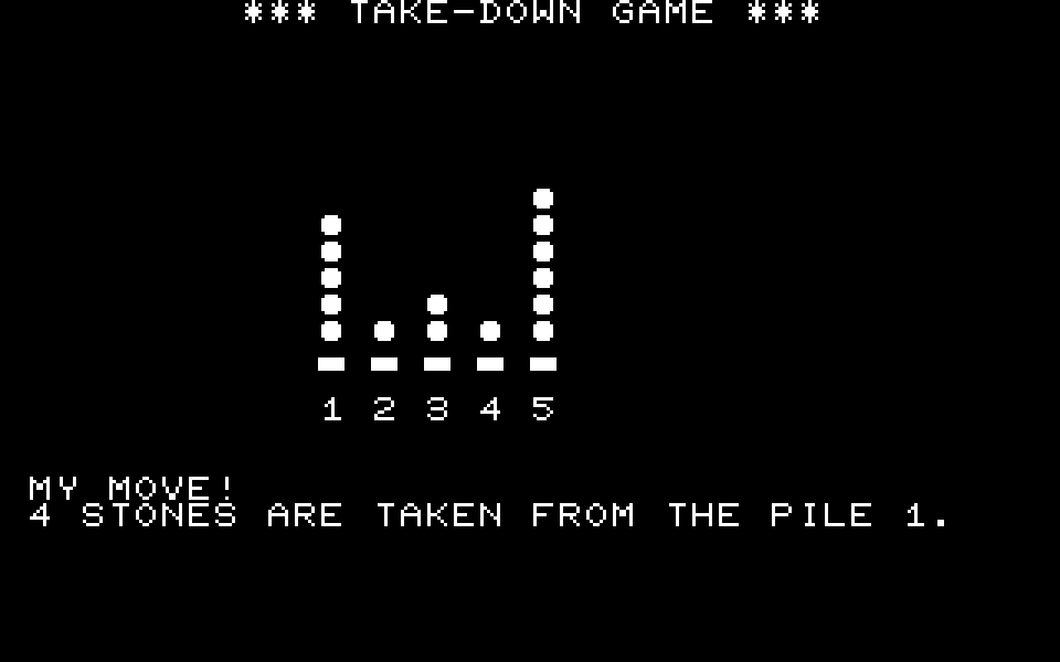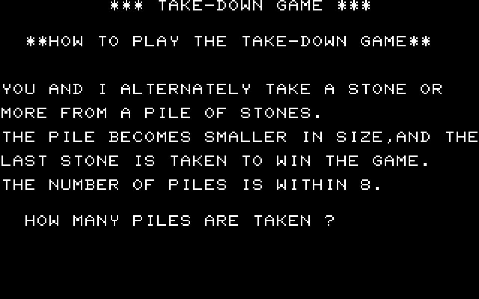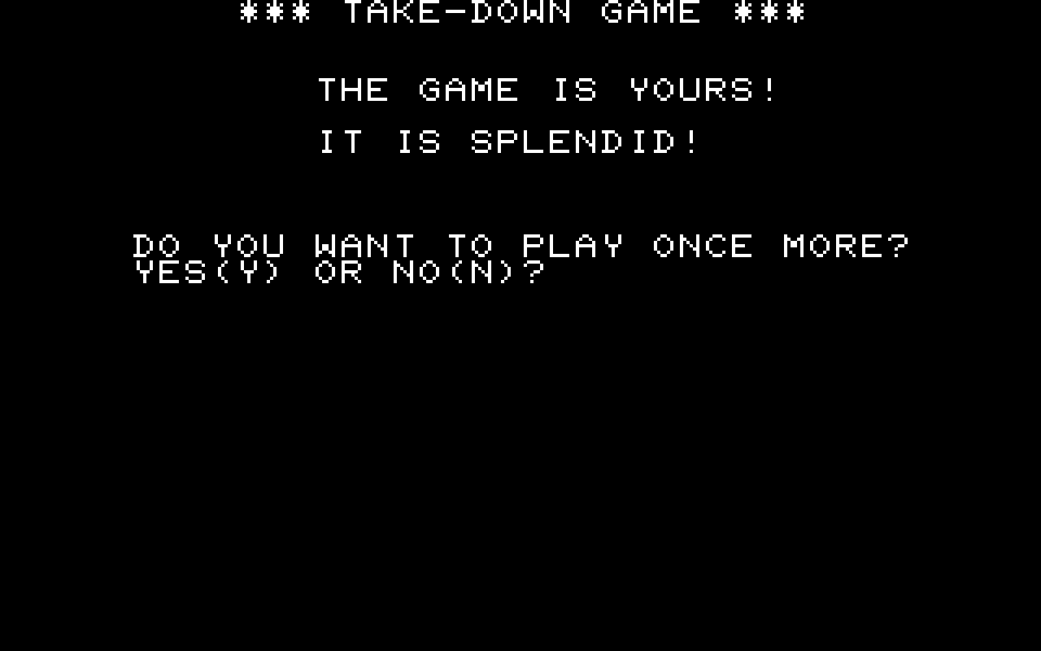 Take-Down Game funker helt fint, sånn sett. Jeg hadde dette spillet på min Sharp MZ-80A i barndommen, og jeg husker at jeg gikk fra å syntes det var skikkelig teit (fordi det ikke hadde action og jeg ikke skjønte bæret) til å bruke ganske mye tid på det, og ha det moro med det. Jeg hadde selvsagt også fryktelig få alternativer, men det forringer ikke gleden jeg en gang opplevde ved å spille dette spillet.