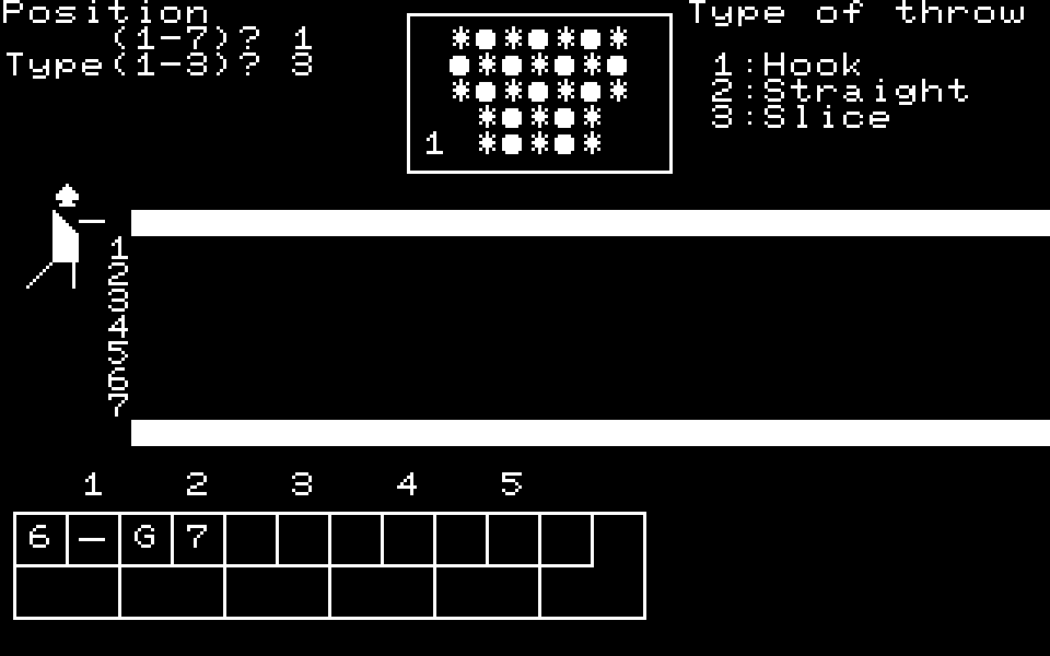 Kort sagt velger du mellom syv posisjoner å kaste ballen fra, og så velger du mellom tre typer kast («slice», «straight» og «hook»). Så får du se resultatet. Avhengig av valget vil ballen enten dra mot venstre, høyre eller gå sånn omtrent rett-frem. Men ballen påvirkes også av tilfeldigheter, så selv om du finner «perfekt» posisjon og kast, kan resultatet bli mindre optimalt.