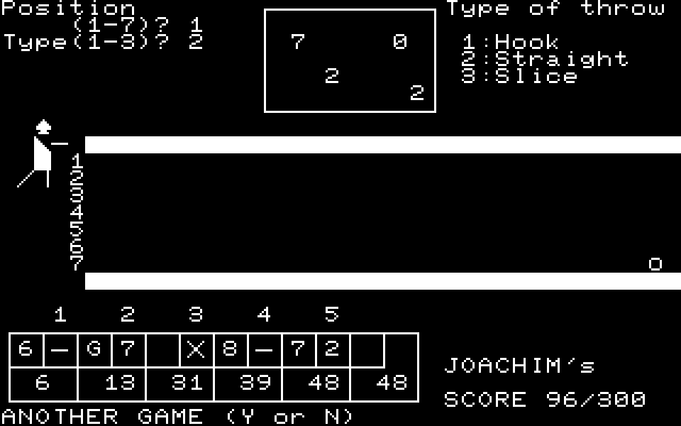 Jeg tror nok et tekstbasert bowlingspill kan fungere relativt godt, men da må du få flere valgmuligheter og rom for strategi enn her. Ah, og man må kunne være flere spillere, for du skal være skremmende glad i bowling for å gjøre det alene.