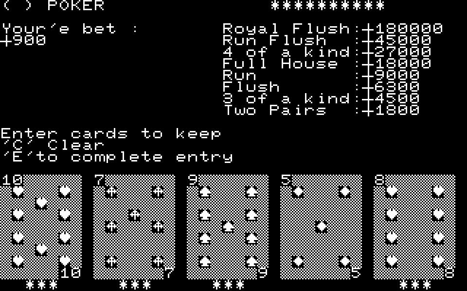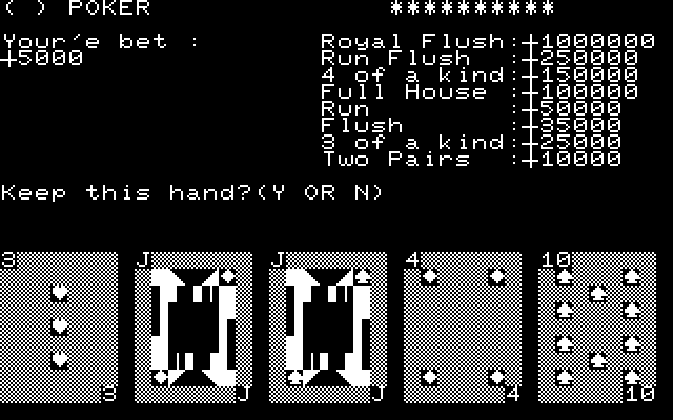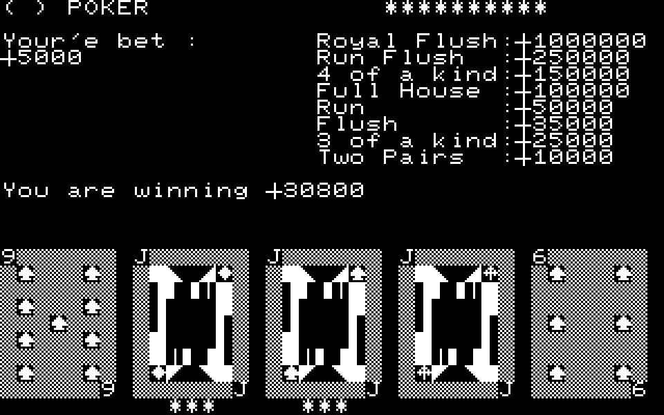 Skjermbildet viser først de ulike kortkombinasjonene, og oddsen. Så må du velge hvor mye du skal vedde. Deretter vises premieoversikten, og du får utdelt fem kort. Disse vises «grafisk», riktignok uten spesielt god SharpSCII-kunst. Du fortsetter med å velge hvilke kort du vil holde før du får nye kort, og hvis du var heldig blir det noen virtuelle grunker i premie.
