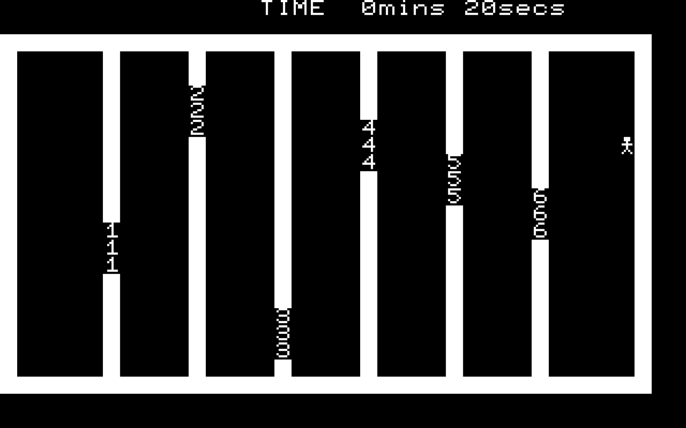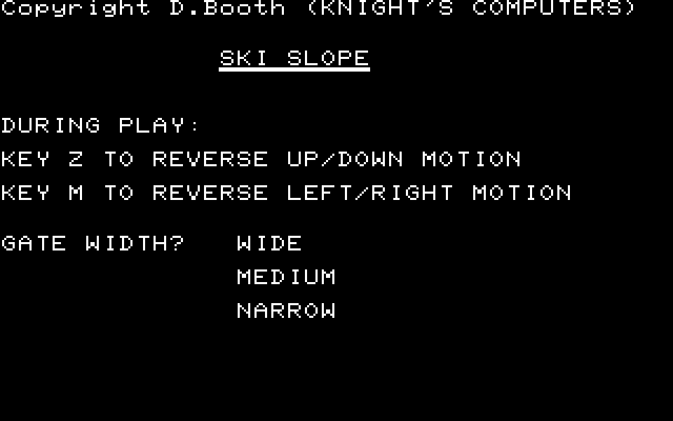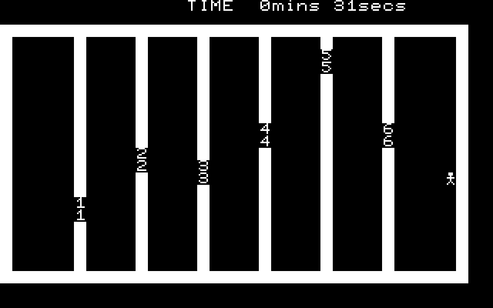 Det første «arkadespillet» her. Jeg skjønner ikke hva det har med ski å gjøre, men okay. Konseptet er som følger: Du styrer en strekfigur – dette er et av de innebygde tegnene i maskinens tegnsett – som skal komme seg fra høyre side av skjermen til venstre så raskt som mulig. Skjermen er delt inn i seksjoner, hver med en port mellom seg.