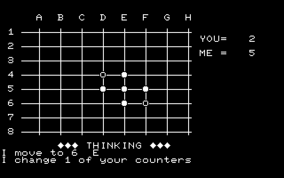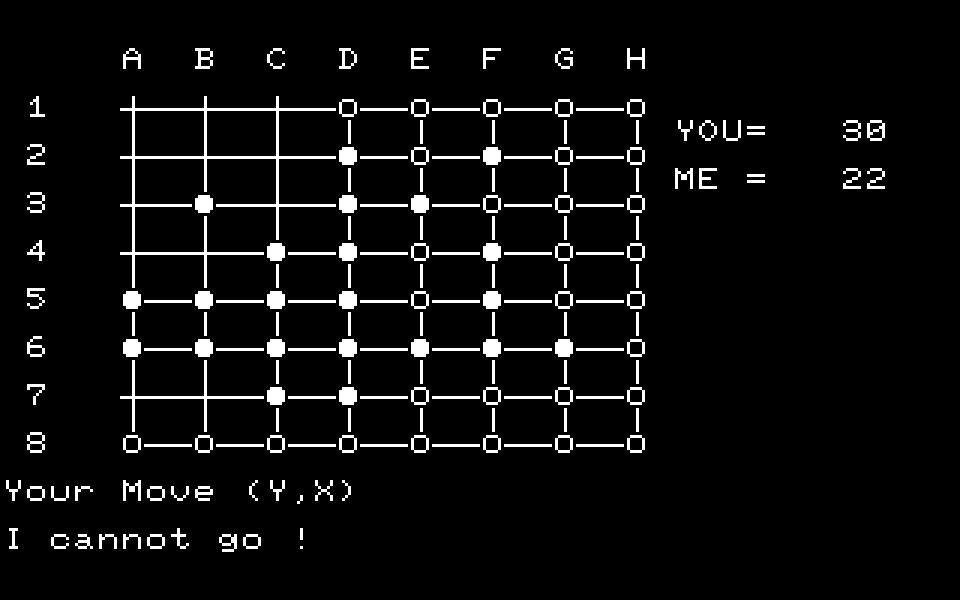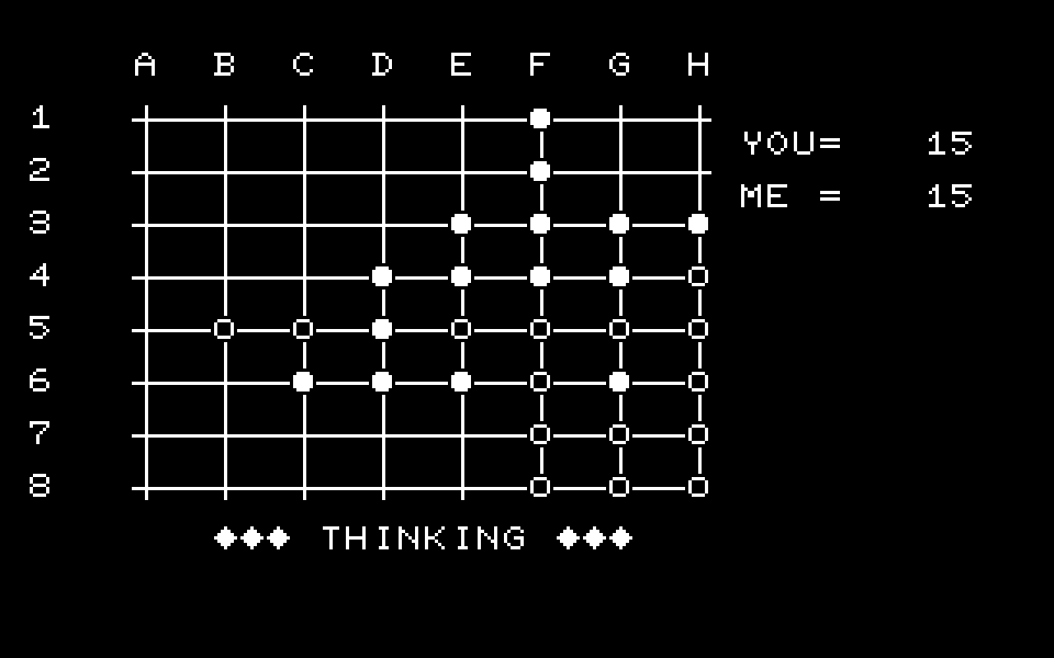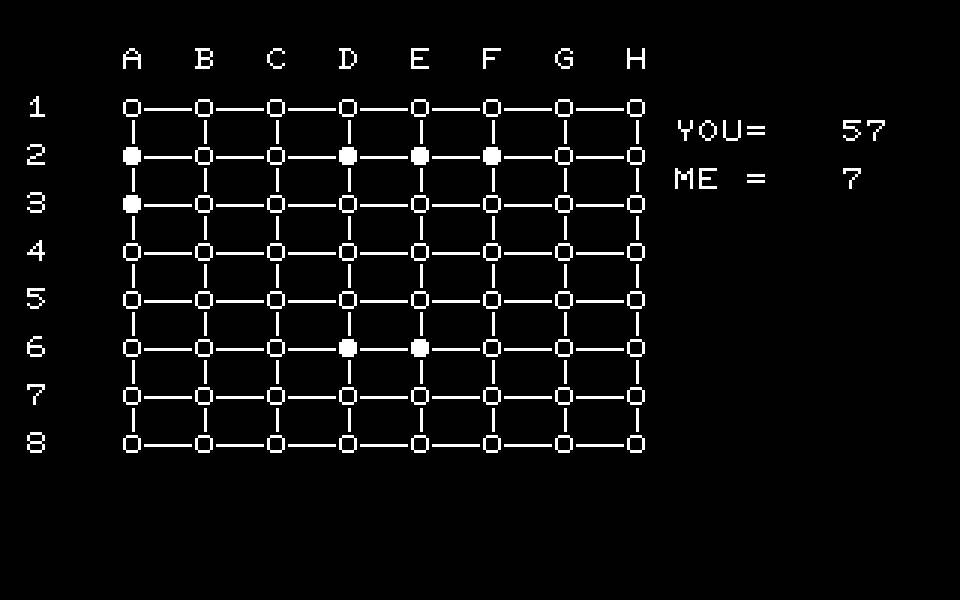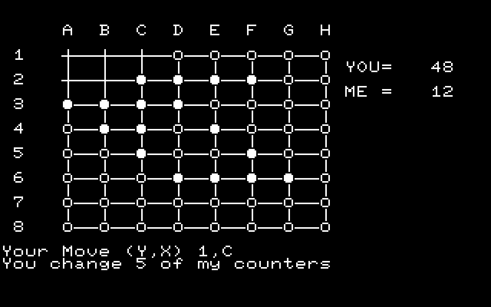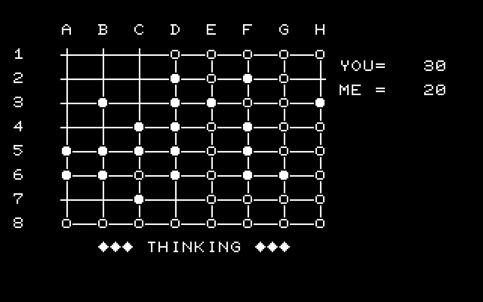 Spillet fungerer ellers helt fint. Det går litt treigt, da datamaskinen trenger mye tid på å tenke, og enda litt mer tid på å tegne opp brettet etter hver tur, men jeg ble aldri irritert over ventetiden. Kontrollene er greie; du skriver inn hvor du vil putte den neste brikken din (tallet for raden fulgt av bokstaven for kolonnen), og ikke noe kunne vært enklere enn det. Annet enn å bruke musen, da, men dette er Sharp MZ-80K, ikke Xerox Alto (slike referanser forventer vi at du som Spillhistorie-leser tar på stående fot).