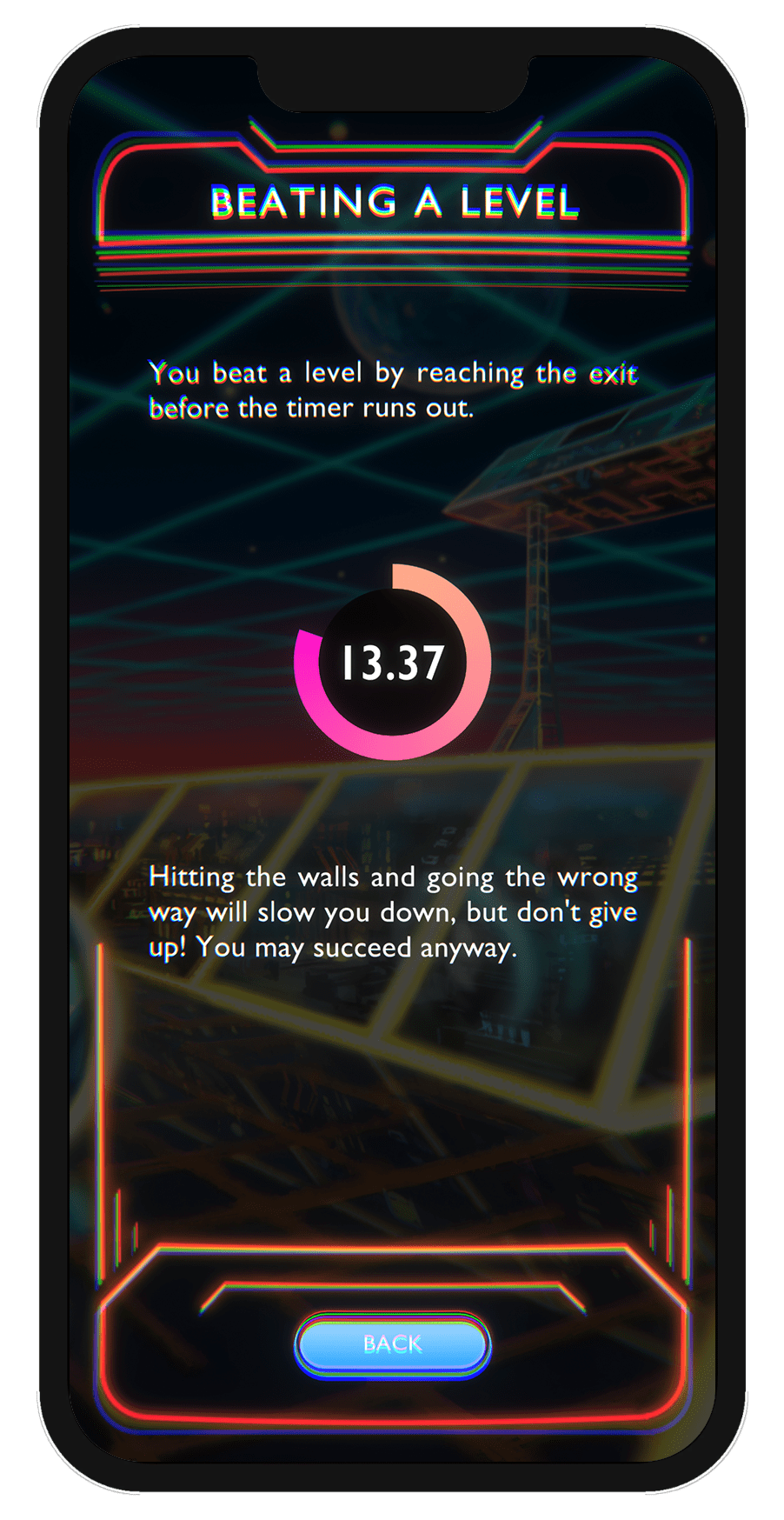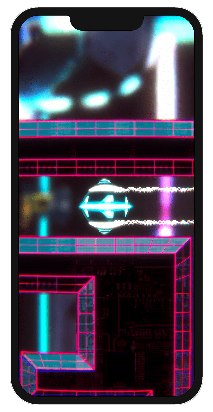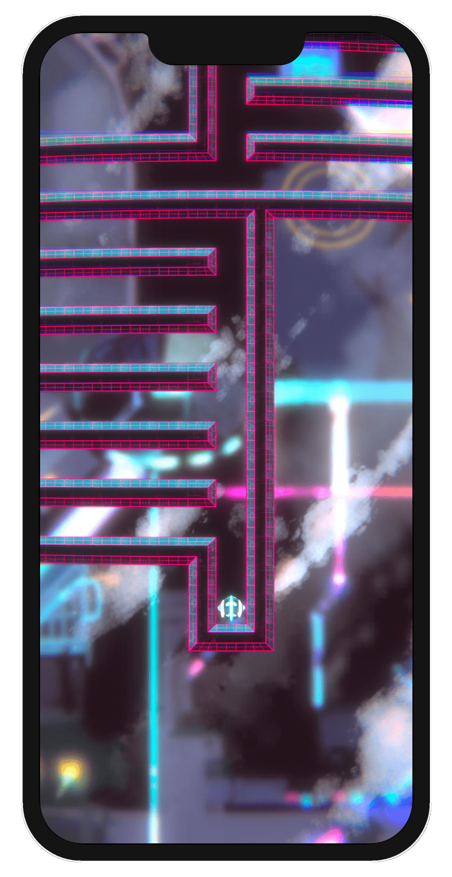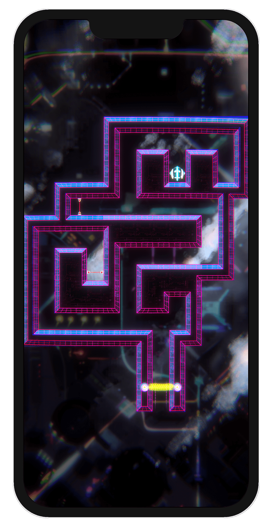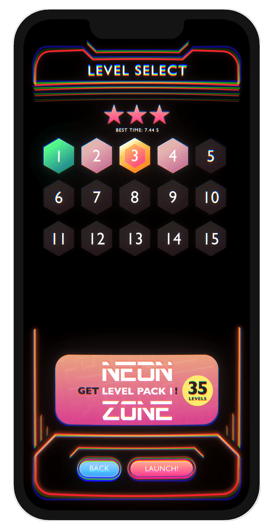 Spillet vi nå lanserer, under det nye navnet «Neon Zone» er i hovedsak det samme spillet som jeg lagde på et par timer i Construct II, men selvsagt mye mer polert. Det har 50 brett, tøff neon-estetikk og har nesten en time spesialskrevet musikk. Noe av det morsomste vi har tilført er muligheten til å konkurrere med venner gjennom Apples eget Game Center. Å se kompiser på lista som har klart et brett tre hundredeler raskere enn deg kan vekke konkurranseinstinktet hos de aller fleste.