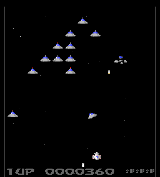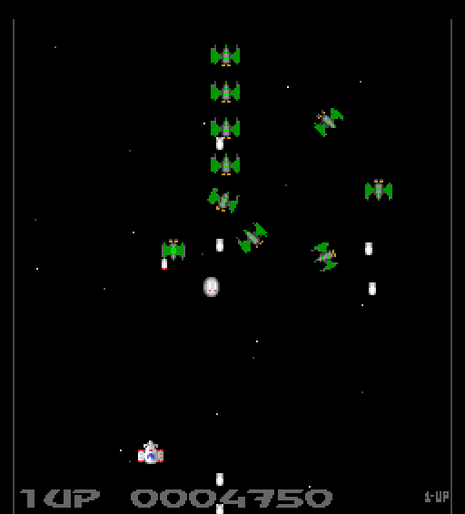 Men Galaga er en finjustert liten perle av spillbarhet. Det er ikke Galaga ’92. Utviklerne har for eksempel gjort romskipet ditt veldig treigt, og før du får i alle fall én hastighetsoppgradering er det fryktelig lett å havne i situasjoner der du er dømt til å dø fordi fiendene suser inn (på en irriterende uforitsigbar måte) og slipper bomber du ikke kan unngå. På senere brett kan du nesten bare glemme det. Og jada, hvis du dør mister du alt du har av oppgraderinger.