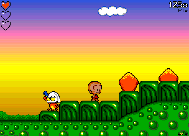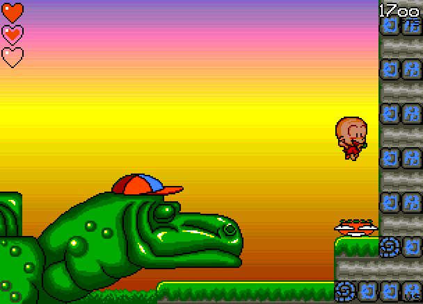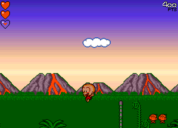 Så må jeg jo samtidig innrømme at B.C. Kid egentlig ikke er et spill som appellerer så voldsomt til meg. Det er et søtt plattformspill med en huleboerunge i hovedrollen, og det var egentlig ment for et yngre publikum. For all del, det er trivelig å spille, og jeg syntes også det er kult når det for eksempel popper opp en svær vulkan rett foran meg (i spillet, ikke i virkeligheten, det hadde vært kjipt). Demoen avsluttes dessuten med at du hopper på hodet til en svær stegosaurus (hele det siste brettet er ryggen til øgla), som så … vel, se her: