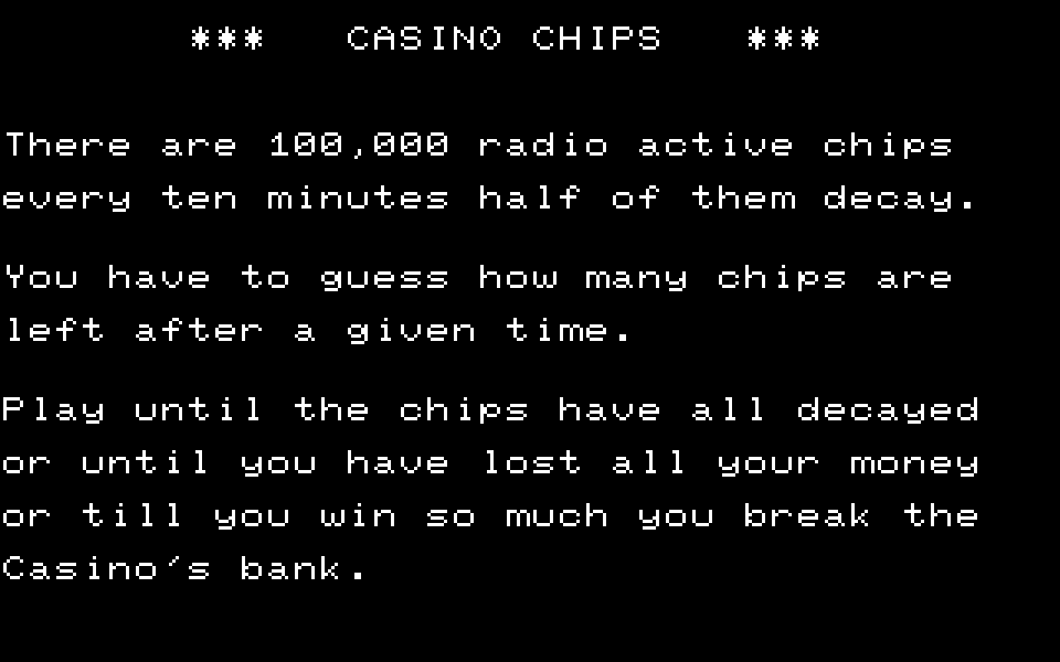 Konseptet er som følgende: Du starter med 100 000 chips. Alle er radioaktive, og hvert tidende minutt vil halvparten av dem brytes ned (jeg mener at det finnes et par obskure små spill oppkalt etter denne prosessen). Så gir spillet deg et gitt tidsrom, og poenget er å gjette hvor mange som er igjen etter at den tiden har gått ut. Deretter fortsetter prosessen.