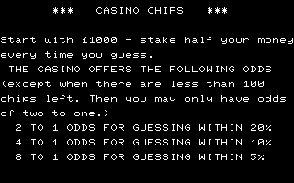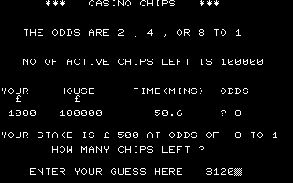 For å gjøre det litt mer interessant, kan du selv velge «odds». Det vil egentlig bare si at du velger hvor nærme du må være det nøyaktige svaret for at ditt svar skal bli godkjent. Jo høyere «odds», jo nærmere må du være – og jo mer penger vinner du om svaret er korrekt. Spillet fortsetter uansett.