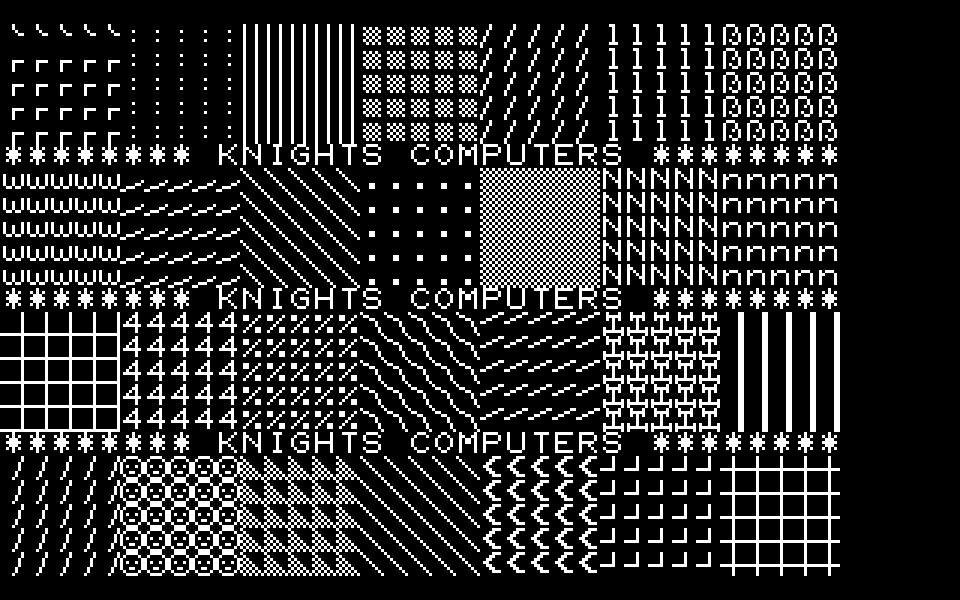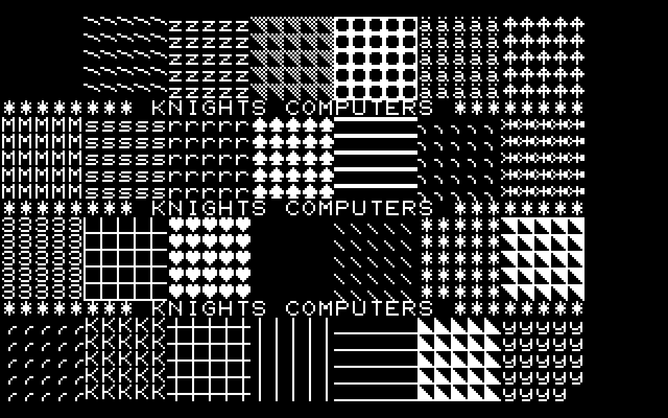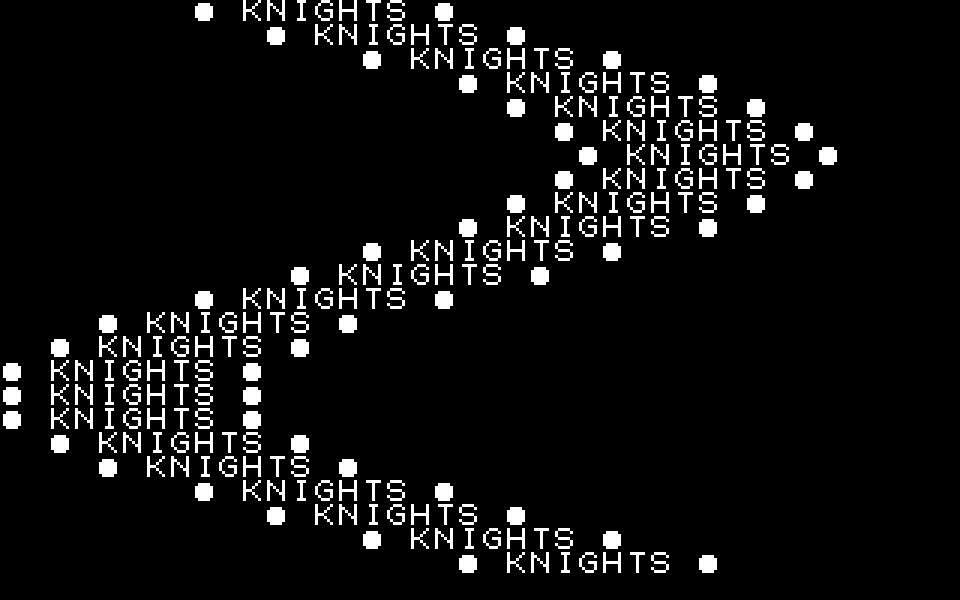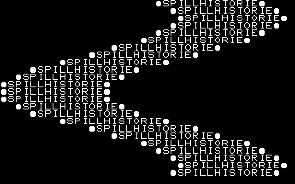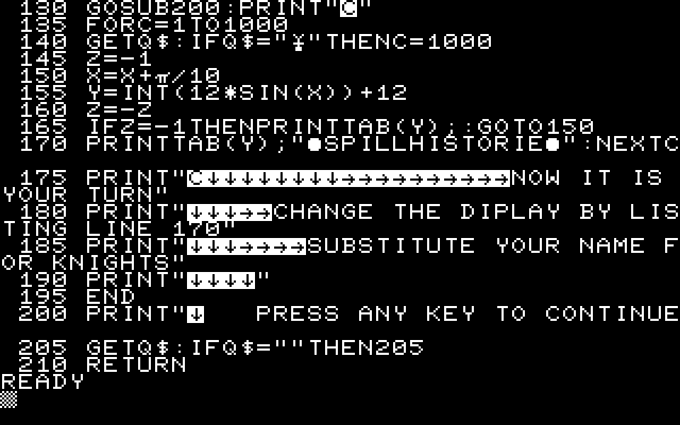 Jeg begynner å savne puppeversjonen av stein, saks og papir. Her får vi noen (hypnotiske?) mønstre tegnet opp på skjermen. Jeg tipper dette er enda et programmeringseksempel fra en manual.