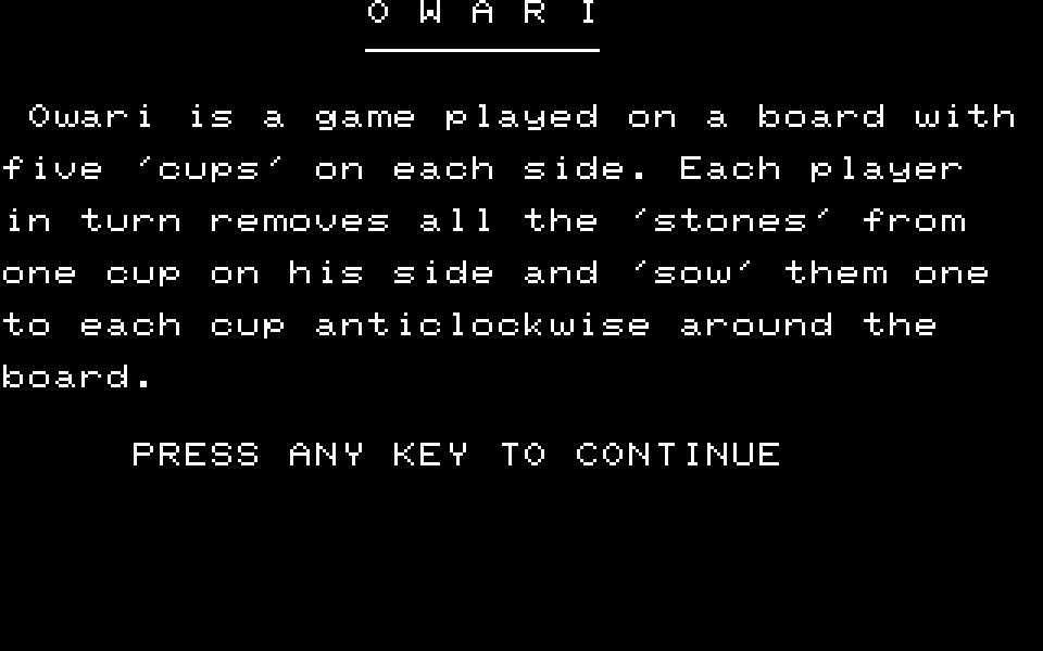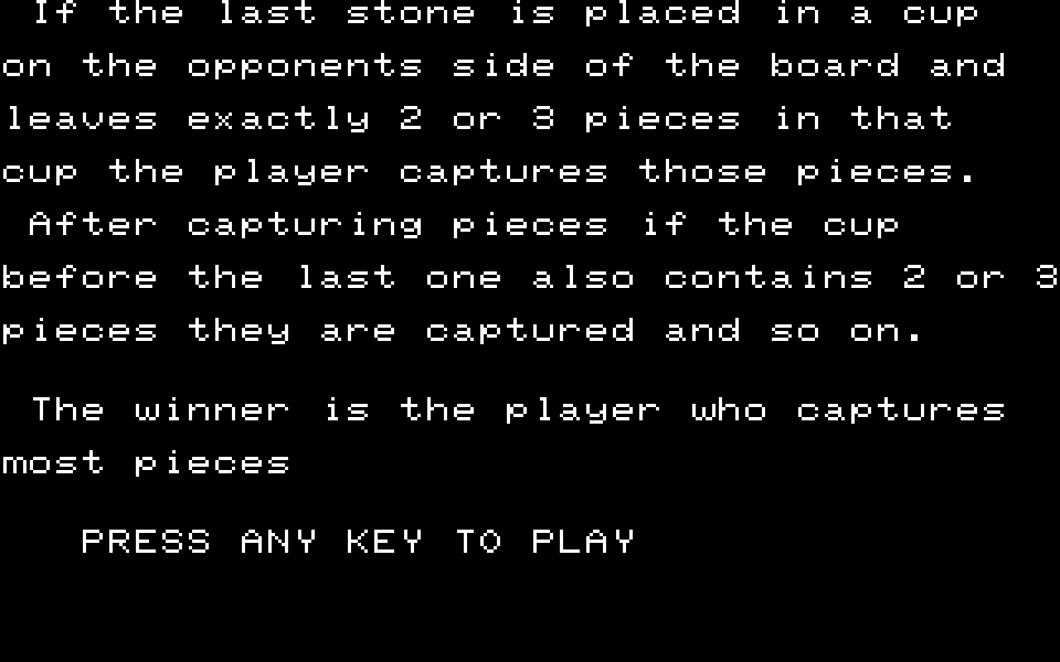 Dette er en versjon av det afrikanske spillet Oware (jeg har alltid trodd det het Awari), som er et spill i samme slekt som Mancala. Enda en slager på gamle datamaskiner, og en variant dukket for eksempel opp i den viktige boken 101 BASIC Games i 1973.