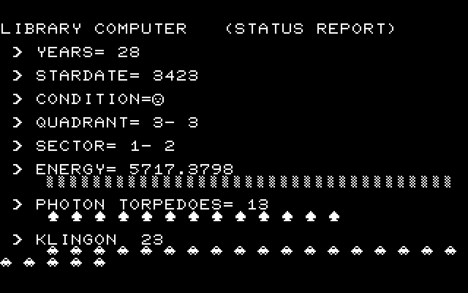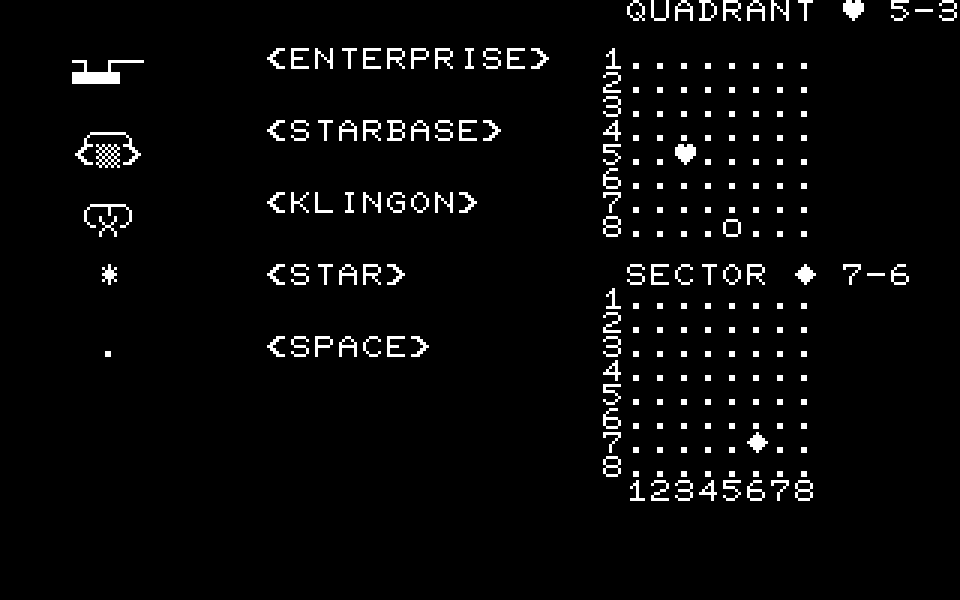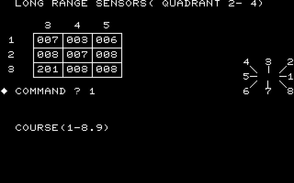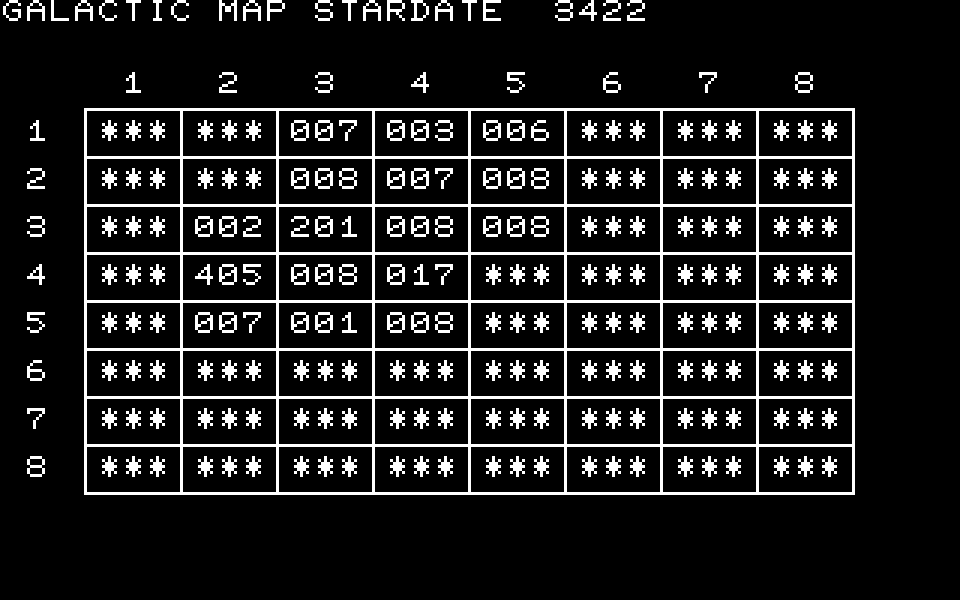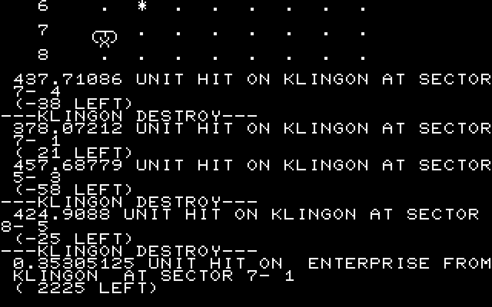 Altså, jeg spiller dette spillet litt, og får drept noen Klingon-skip. Det er egentlig ganske rett-frem, selv om det sikkert virker utrolig kryptisk på skjermbildene. Ved å bruke langdistansescanneren får du opp informasjon om nabosektorene. Informasjonen kommer i form av tre tall, som henholdsvis forteller hvor mange fiender, vennligsinnede romstasjoner og stjerner det er i den aktuelle sektoren. 214 betyr for eksempel to fiender, en rombase og fire stjerner.
