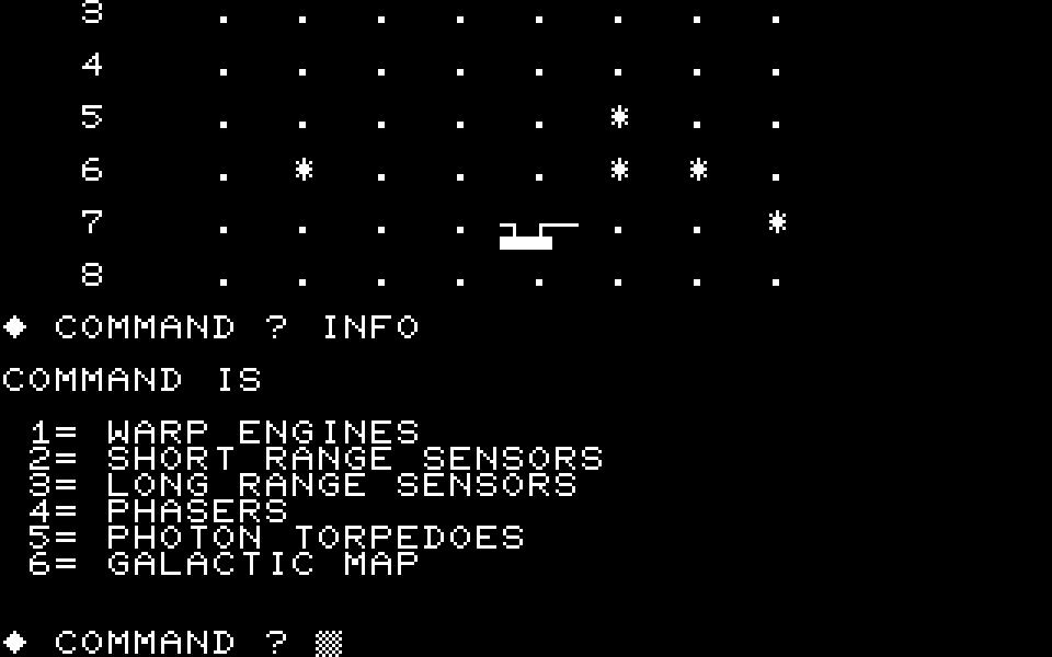 Dette var tekstbaserte strategispill der du fikk i oppdrag å overvinne så mange fiendeskip som mulig, i et univers bestående av datagenererte sektorer. Spillene ble typisk spilt på printerterminaler, og kart og status ble printet ut for hver tur. Så måtte spillerne studere informasjonen, og gjøre sitt neste trekk.